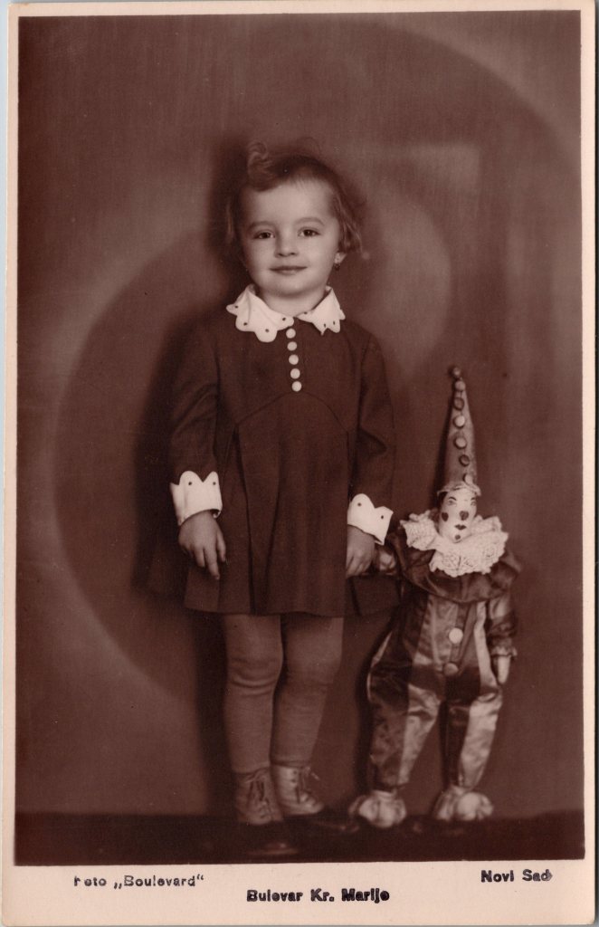 This vintage divided back real photo postcard features a sweet little girl and her fancy Pierrot doll. The girl’s photo was taken at the Boulevard Studio located in Novi Sad, Serbia. This photo postcard is in very good condition (see scans).