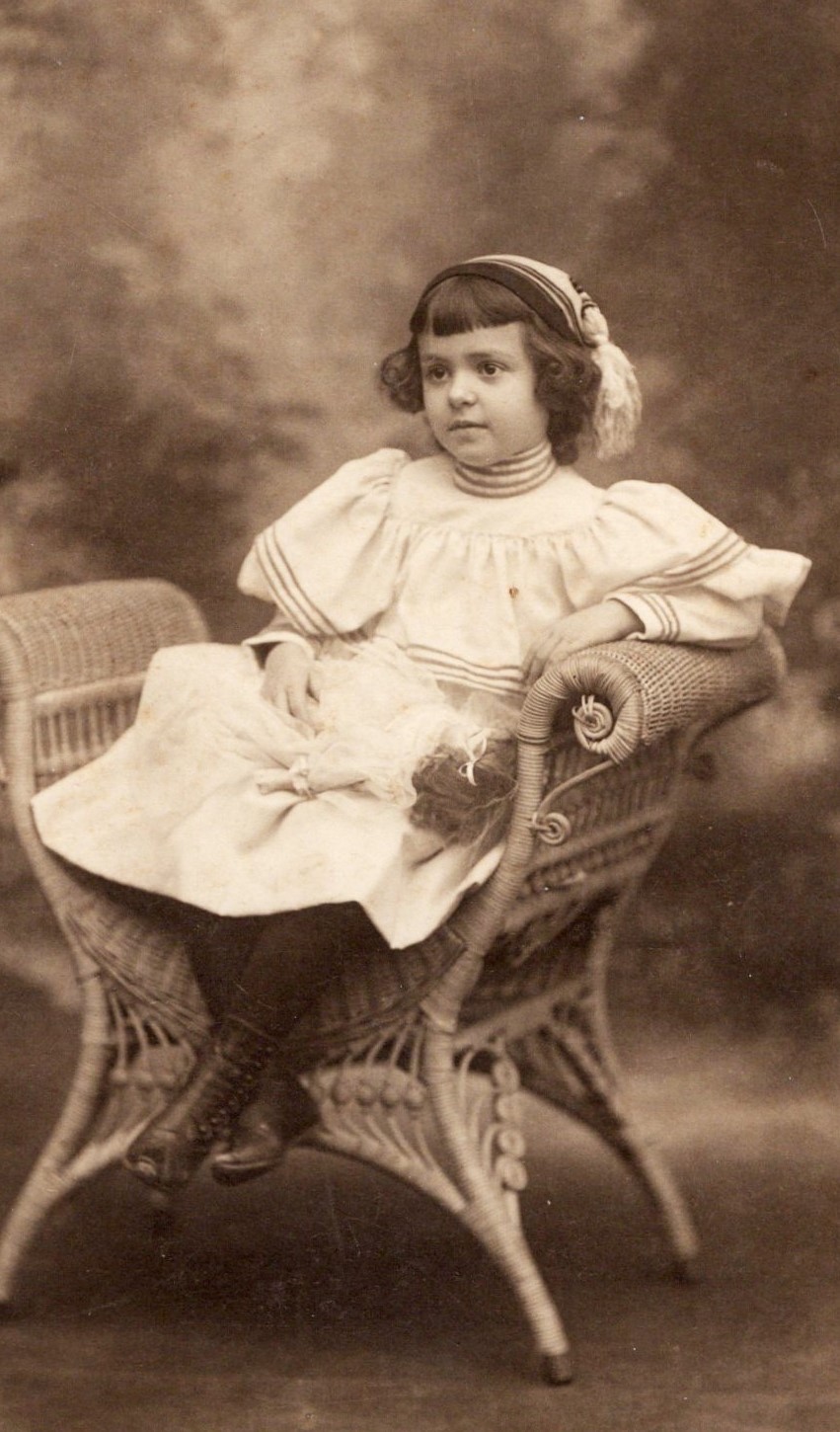 An adorable little girl sits for her portrait inside an unknown studio, in an unknown location. Identifying information about the photographer was lost when a previous owner of the image, trimmed the photograph to fit into a frame. The child posing in this photograph is seated in a wicker chair. She is wearing a cute dress and terrific hat. The child is smiling for the photographer and appears quite relaxed and radiant in front of the camera. There appears to be a toy lying next to her on the chair. It looks to be a stuffed animal, perhaps, a teddy bear. This cabinet card measures about 6.50″‘ x 4.25″. Overall, this cabinet card portrait is in good condition (see scans).