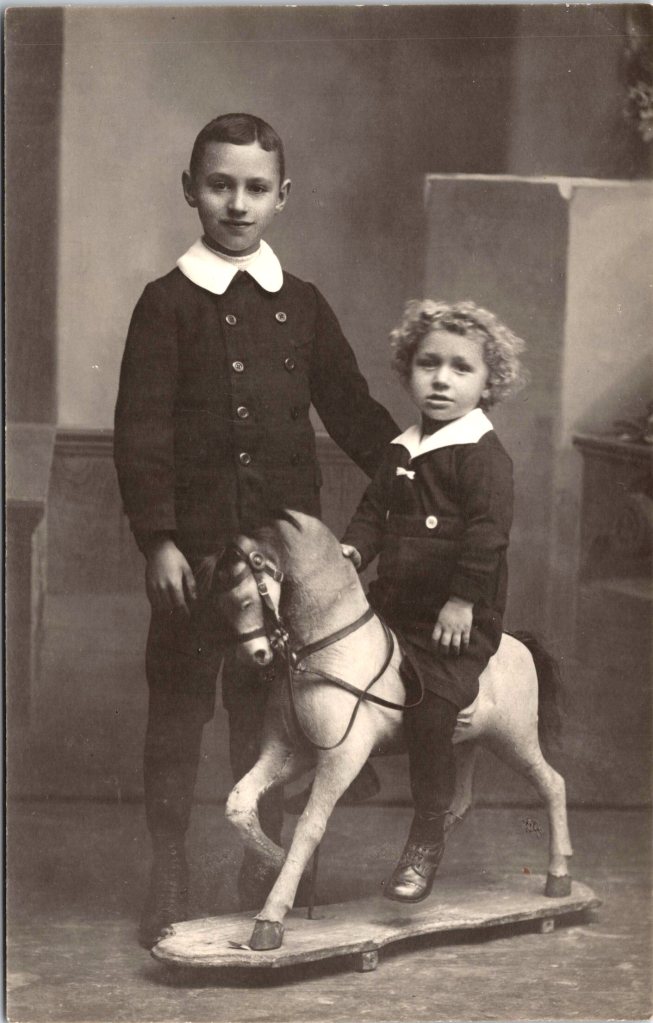 This vintage real photo postcard features two well dressed and adorable siblings and their rocking horse. The youngest child is sitting in the saddle. Note the detail of the horse. The toy horse also has a harness and reins. This likely one-of-a-kind photo postcard was made by a private studio. SOLD