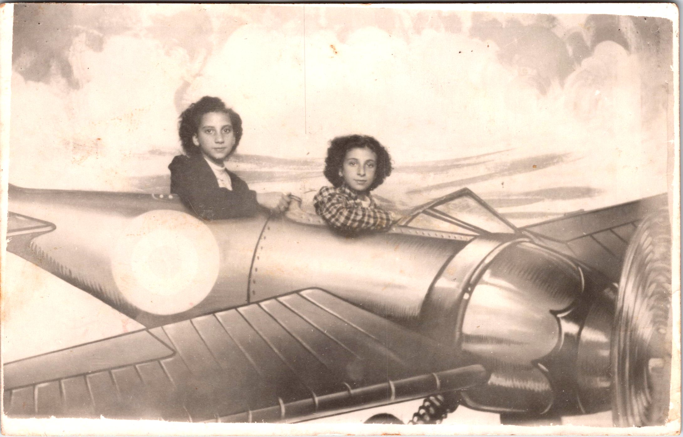 This vintage divided back real photo postcard features two young girls flying an airplane. The plane is of the photo studio variety. The girls, judging by appearance, are presumably sisters. Although it is not uncommon to see a studio airplane on a postcard, this particular plane prop is uncommon. (SOLD)