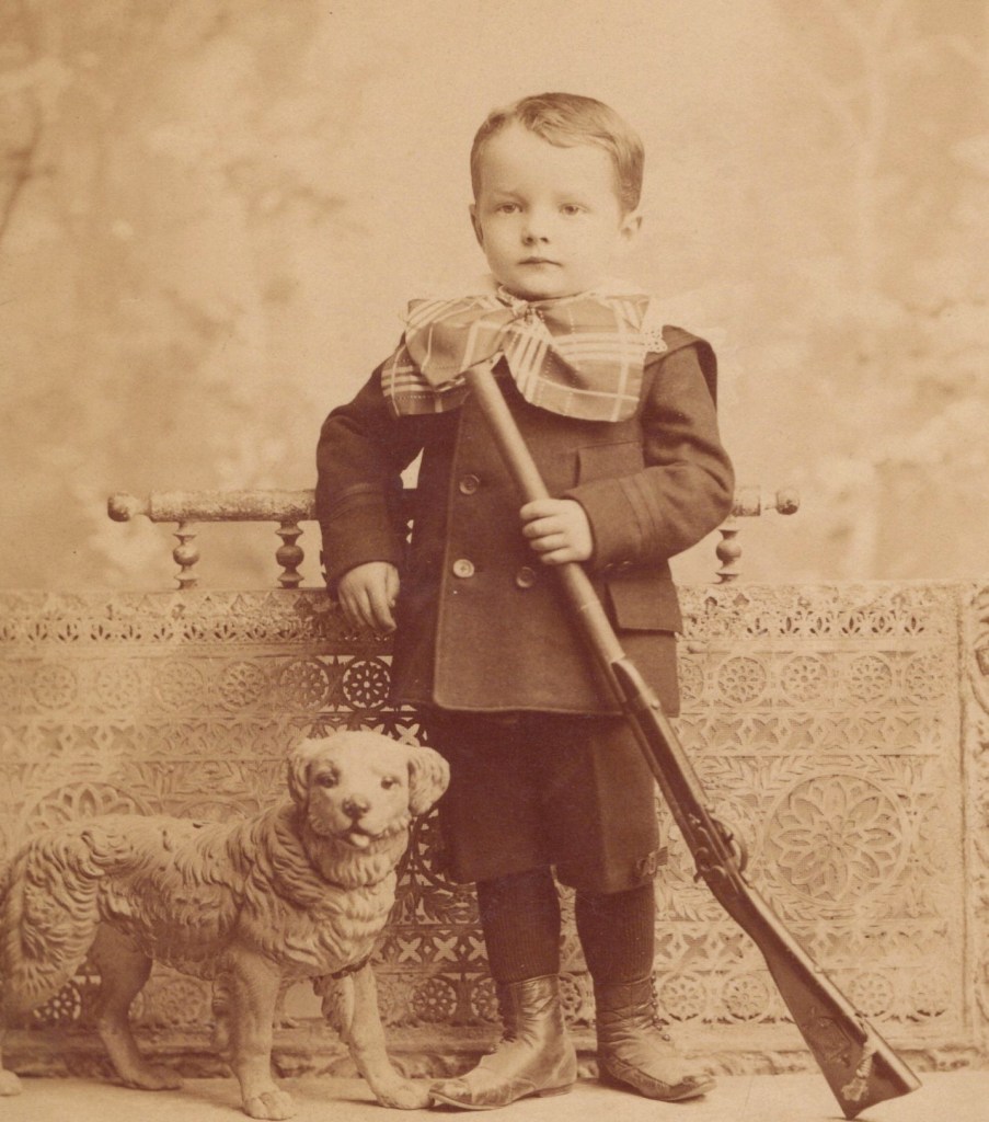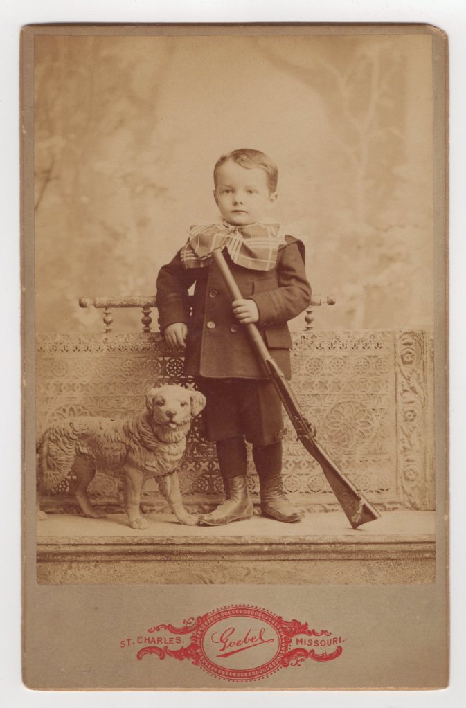 An adorable little boy with a big bow tie poses with a ceramic dog and a toy rifle at the Goebel studio in St. Charles, Missouri. Rudolph Henry Goebel (1835-1923) was born in Germany and came to the United States in about 1856. Upon arrival, he quickly began his career as a daguerreotype artist in St. Charles. He married Emille Julia Dyer (1836-1912) who was also an immigrant from Germany. The couple had six children. Goebel continued to work as a photographer according to census data. In the late 1870’s, Goebel began working as a travelling photographer in area around St. Charles. He did both scenic views as well as portraits. He also worked as a school photographer in St. Charles. He retired sometime between 1915 and 1920. A photograph of, and photographs by Goebel can be seen at the Missouri History Museum. This cabinet card portrait is in good condition (see scans).