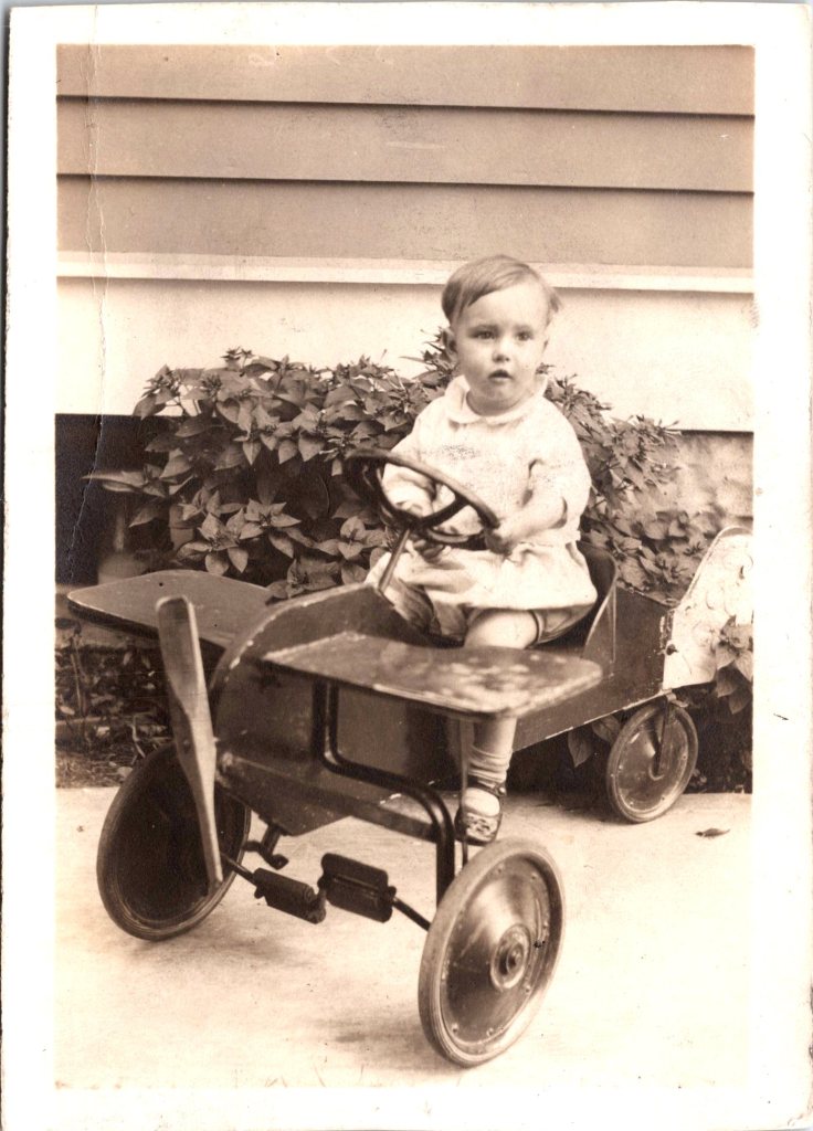 This vintage photograph features a child sitting in an antique toy wooden pedal airplane. The plane has a propellor and it’s pedals are clearly visible in the photo. This vintage photograph measures about 3 1/2 x 4 7/8 inches. SOLD