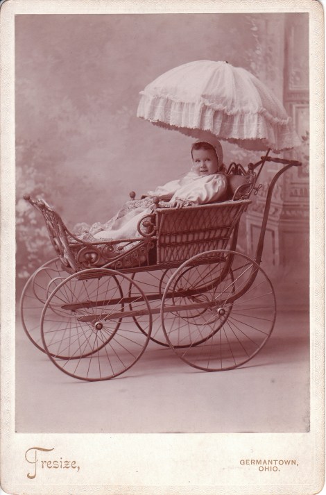 This cabinet card photograph captures baby sitting comfortably in a luxury baby carriage. There will be no discomfort from the sun for this cute baby; courtesy of the large umbrella built into this Rolls Royce of baby prams. The photographer is Tresize,of Germantown, Ohio. Research reveals that Ohio had a number of photographers named Tresize, and it is unknown which Tresize is responsible for this image? Dayton, Ohio was the home of The Tresize Brothers Studio as well as photographer S. P. Tresize. Samuel P. Tresize was a photographer located in Logan, Ohio. J.Q. A. Tresize was a photographer in Zanesville, Ohio and a partner in the Photography Studio named Jaquary and Tresize. William C.Tresize was a photographer in McConnelsville, Ohio. Suffice it to say, it is unknown which Tresize photographed this image. To see other photographs of baby carriages, click on this site’s category “Baby Carriages”. SOLD| bmarshphd on ANNIE DUNSCOMBE : BURLESQUE AC… | |