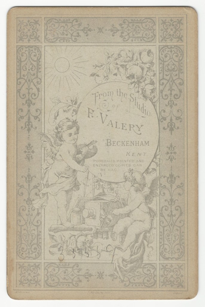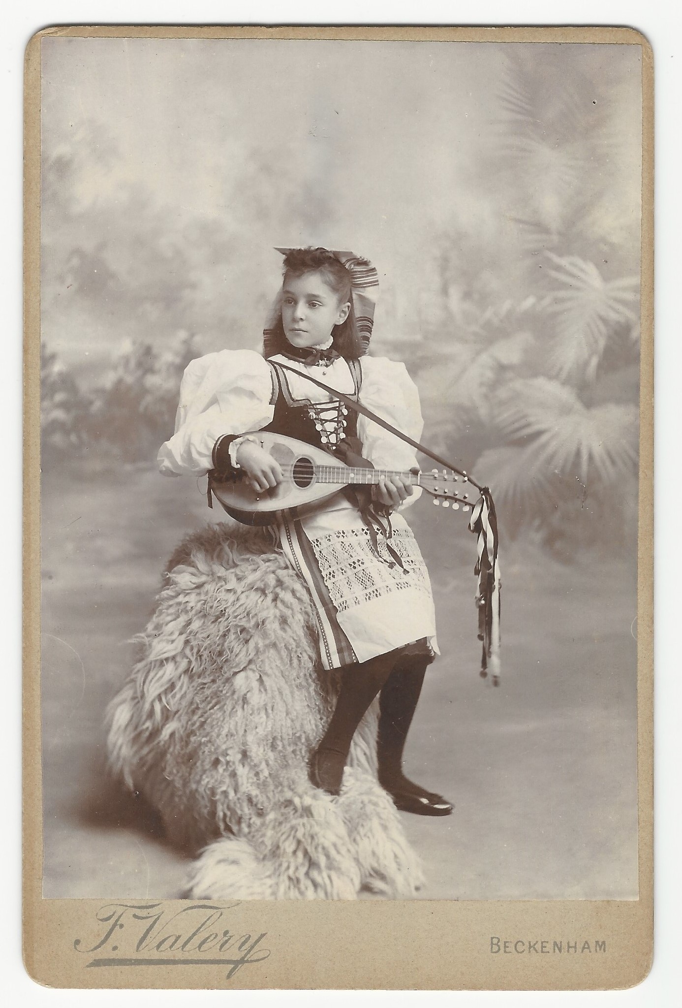 This exceptional cabinet card portrait features a young girl wearing a Tyrolean costume and playing a mandolin. She looks absolutely adorable. The photograph comes from photographer F Valery who operated a studio in Beckenham, England. When Frederick Valery went home to his wife and family, he was no longer Frederick Valery. Instead he became James Frederick Lowrie. Apparently, Frederick Valery was Lowrie’s “nom de camera”. Lowrie was born in London in 1853. He was married to Millie (1855-?) and the couple had two sons and one daughter. Lowrie was a photographer from at least 1901 through 1907. The British Journal of Photography (1906) reported the “sudden death” of Mr. Lowrie. He had two studios, one in Beckenham, and the second one in Bromley. The journal states that Lowrie “dropped dead” while photographing a girl in his Bromley studio. He was 53 years old at the time of his death. His cause of death was heart disease. If this image is typical of his work, Lowrie certainly was a gifted photographer. This cabinet card portrait is in very good condition (see scans).