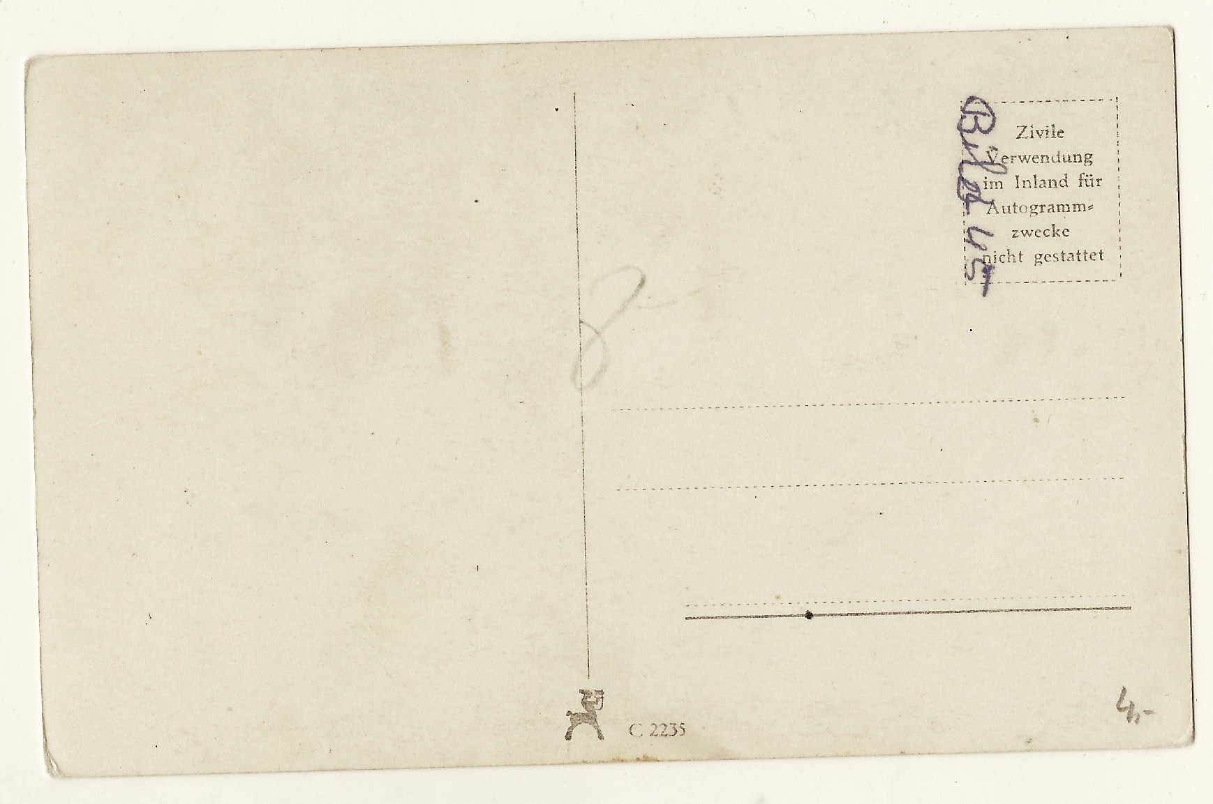 This real photo postcards feature German film actress Marina von Ditmar (1914-2014), a leading lady of the 1930’s and 40’s. . She was born in the Russia Empire and was of Baltic German descent. When she moved to Germany she studied acting. Her first roles were appearances at Schauspielhaus, Bremen, and the Altes Theater (Leipzig). In 1937 she joined the ensemble at the Volksbuhne in Berlin and by 1940, she was a permanent actress at this venue. Her first major movie success was in “The Csardas Princess” (1934). In 1943, she starred in “Muchhausen”, a film that had great commercial success. Von Ditmar was also well known for her role in “The Big Shadow” (1942). She appeared in several Nazi propaganda film including Stukas (1941). She married D. Hans-Georg Dehnhardt (1913-2001), a leading physician and owner of a sanitarium, Soon after her marriage, she retired from acting. The IMDB credits Miss von Ditmar with thirty film roles. This postcard was published by Film-Forto-Verlag and was part of a series (A 3622/1). The photographer was Baumann and there is an advertising logo for the German film company UFA. Film-Foto-Verlag published this postcard. The company became known for it’s postcard portraits of film stars of the German and Italian cinema. The company was formerly known as Ross Verlag but changed it’s name in 1941.This postcard is in excellent condition (see scans).
