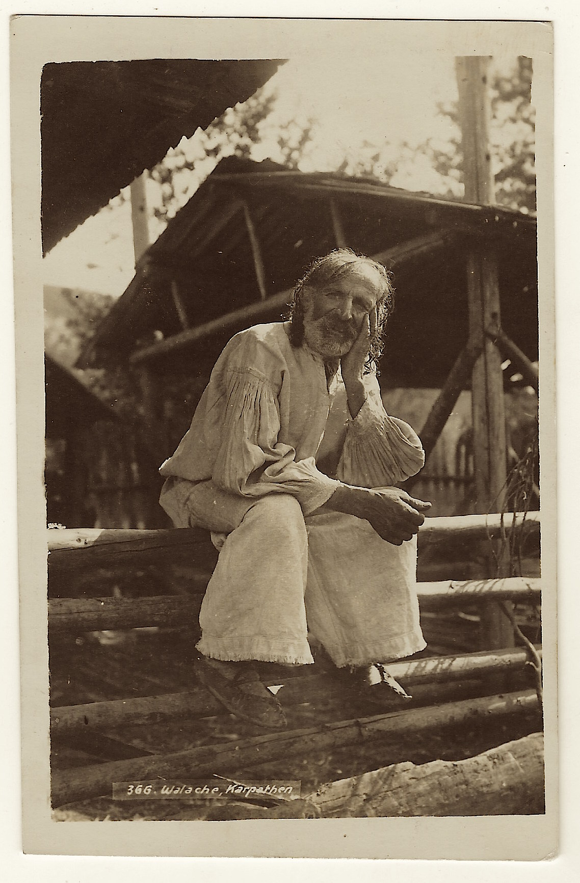 This vintage real photo postcard features a Carpathian man seated on a fence, somewhere in the UKRAINE. The gentleman appears contemplative and forlorn. He has a most captivating face. My impression is that he has seen a lot of hardship in his lifetime. The Carpathian region is a historic area in the border between Central and Eastern Europe. Most of the region is located in Ukraine’s Zakarpattia Oblast. Smaller parts of the Carpathian territory are in Poland and Slovakia. Before World War I most of this region was part of Hungary. After the war it became part of Czechoslovakia. The people of the Carpathian area are ethnically diverse. They are primarily Ukraninian, Rusyn, Lemko, Hungarian, Slovak, Romanian, Bulgarian, and Russian. This vintage real photo postcard is in excellent condition (see scans).