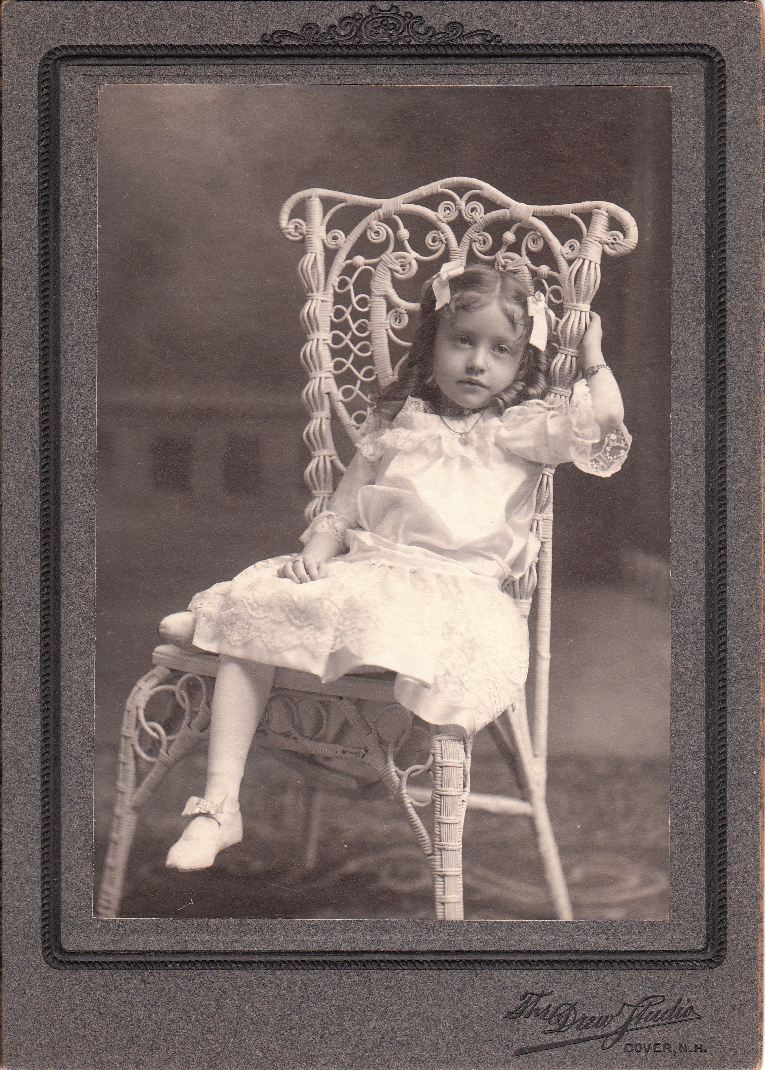An angelic looking young girl dressed in white, poses in an artistic portrait at the Drew Studio in Dover, New Hampshire. The little girl does not appear very happy about the process of being photographed. She has corkscrew curls and is wearing hair ribbons. She is sitting cross legged in a white wicker chair. The photographer of this large format image is A. P. Drew. The Dover Enquirer (1896) has an article which mentions Alfred Palmer Drew. In 1896 a “deluge” and subsequent fire destroyed a business block and three bridges in Dover. The flooding sent the stores on the block down the Cocheco River. The photography studio Drew and Boomer was among the stores washed away. The Bulletin of Photography (1917) contains the obituary of A. P. Drew. He died at the age of 81. He had been born in Dover and had worked as a photographer there for more than 50 years. He retired in about 1914. During the civil war he had been a member of the Strafford Guards. The regiment was originally established in 1822 and a year later became part of the New Hampshire State Militia. In 1864 the Strafford Guards were mustered into service of the Union Army for a period of sixty days. They relieved a New Hampshire artillery unit that had been sent to the front. A. P. Drew served as a corporal.