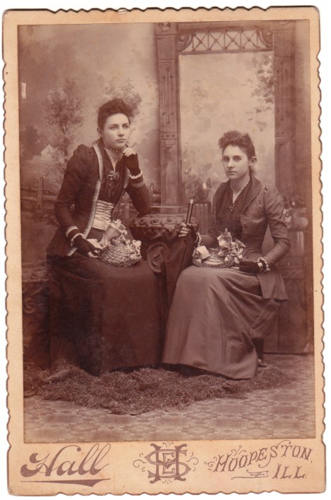 Two pretty young woman pose for their portrait in this scalloped cabinet card produced by the Hall studio in Hoopeston, Illinois. The women do not seem very enthusiastic about having their photograph taken. Each of the subjects have baskets of flowers on their laps and are wearing fingerless gloves. The woman seated on the right in the image is holding what appears to be an umbrella. Both of these ladies have very thin waists. They are probably wearing corsets. Perhaps those corsets are a little too tight and that would explain the pained expressions they display in the photograph.  The photographer, Ervin S. Hall, appears in the 1880 US census. Hall was 25 years old and married (1877) to Violetta Hall (age 27). Hall’s parents were born in Maine but he and his wife were Illinois natives. The couple lived in Hoopeston and Hall worked as a photographer. The 1900 US census found Hall and his wife living in Grant, Illinois with their two children, Ellis (age 17) and Ethel (age 15). Ervin was still working as a photographer. The 1910 US census lists Hall and his wife living in Urbana, Illinois and Ervin still employed as a photographer. The 1920 US census reveals that the couple was living in Kissimmee, Florida and Ervin was working as a hardware salesman. The 1930 US census indicates that Ervin was retired and he and his wife remained in Kissimmee. Research uncovers the story of Hoopeston, Illinois. The town was created in 1871 and named for Thomas Hoopes who had offered his land to be the site of the crossing of two railroads. The business and manufacturing that developed in Hoopeston centered around agriculture. The Illinois Canning Company (1875) and the Hoppeston Canning Company (1878) were established there. Greer College (1890) was also established in Hoopeston.