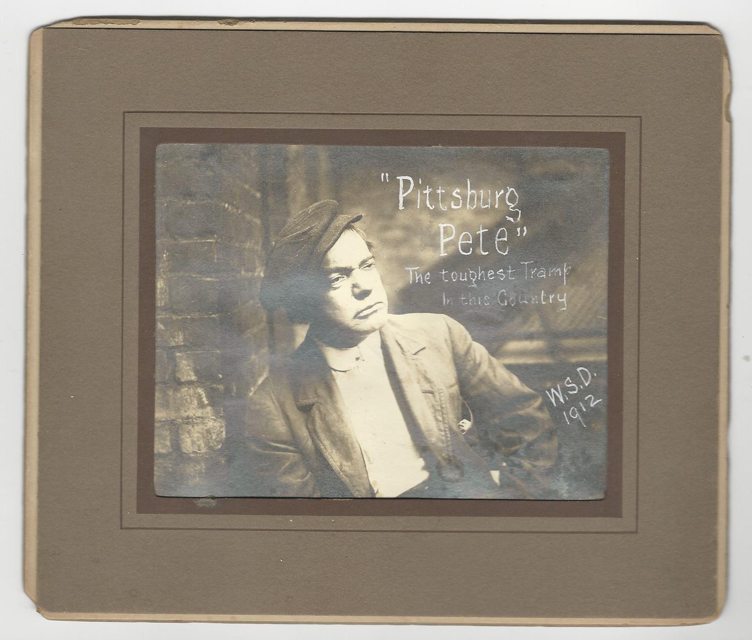 According the caption in this image, this photograph is a portrait of “Pittsburg Pete”. He is noted as being “The toughest Tramp in the Country”. The caption also notes that this photograph was taken in 1912. Preliminary research found references to a “Pittsburg Pete” in some articles about “hobos” and “tramps”. In addition, the Urbana Daily Courier (Illinois) has some articles about criminal activities of a man known as “Pittsburg Pete”. A 1914 article reports the arrest and jailing of a man with that moniker. The man is described as a “familiar street character in this city” and his crime was vagrancy. The article states that the man’s actual name was John Reed. It is unknown whether the tough looking guy in this image is the same “Pittsburg Pete” as the “street character” in Urbana.  (SOLD)