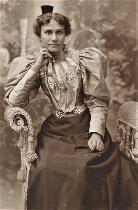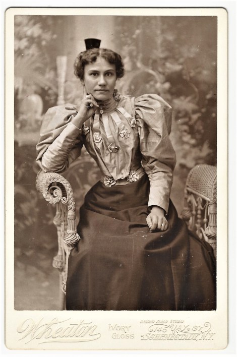 A pretty woman sits in a wicker chair poses for her portrait at the Wheaton studio in Schenectady, New York. She appears pensive as she looks at the photographer. The woman is well dressed. Her blouse has “leg o mutton” sleeves. Such sleeves are voluminous around the biceps and shoulders while fitted at the lower arm and wrist. They became popular between 1825 and 1933. The style reappeared in fashion in the 1890’s and was gone by 1906. It was during the reemergnce of “leg o Mutton” sleeves that this photo was taken. The photographer of this image is Van B. Wheaton (1870-1948). The Anthony Photographic Bulletin (1897) reports Wheaton winning a medal at a photography exhibition. His son, Ivan P. Wheaton was a World War I aviator, race car driver, author, and photographer. SOLD