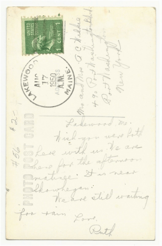This vintage real photo postcard features the theater at Lakewood, Maine. The theater gives the appearance of a large colonial home. The marquee on the front porch is displaying the photograph of the actors and actresses appearing in the current show. Note the two 1940’s automobiles parked in front of the theater. The postcard’s message states that the writer is at the theater for an afternoon matinee. The postcard is addressed to a couple living in Port Washington (Long Island). New York. The card’s postmark reveals that it was mailed in 1950. The postcard has a small chip on the left side of the top border but is in otherwise good condition (see scans). The Lakewood theatre is the official state theater of Maine. It received that title in 1967 from the state legislature. Before that time, the theater was known as “Broadway in Maine”. It began as a vaudeville play house. It was originally built as a hall for Spiritualist Camp Association meetings. The building was built in 1882. In 1884 it was converted into a roller skating rink. In 1898, it became a theater. (SOLD)