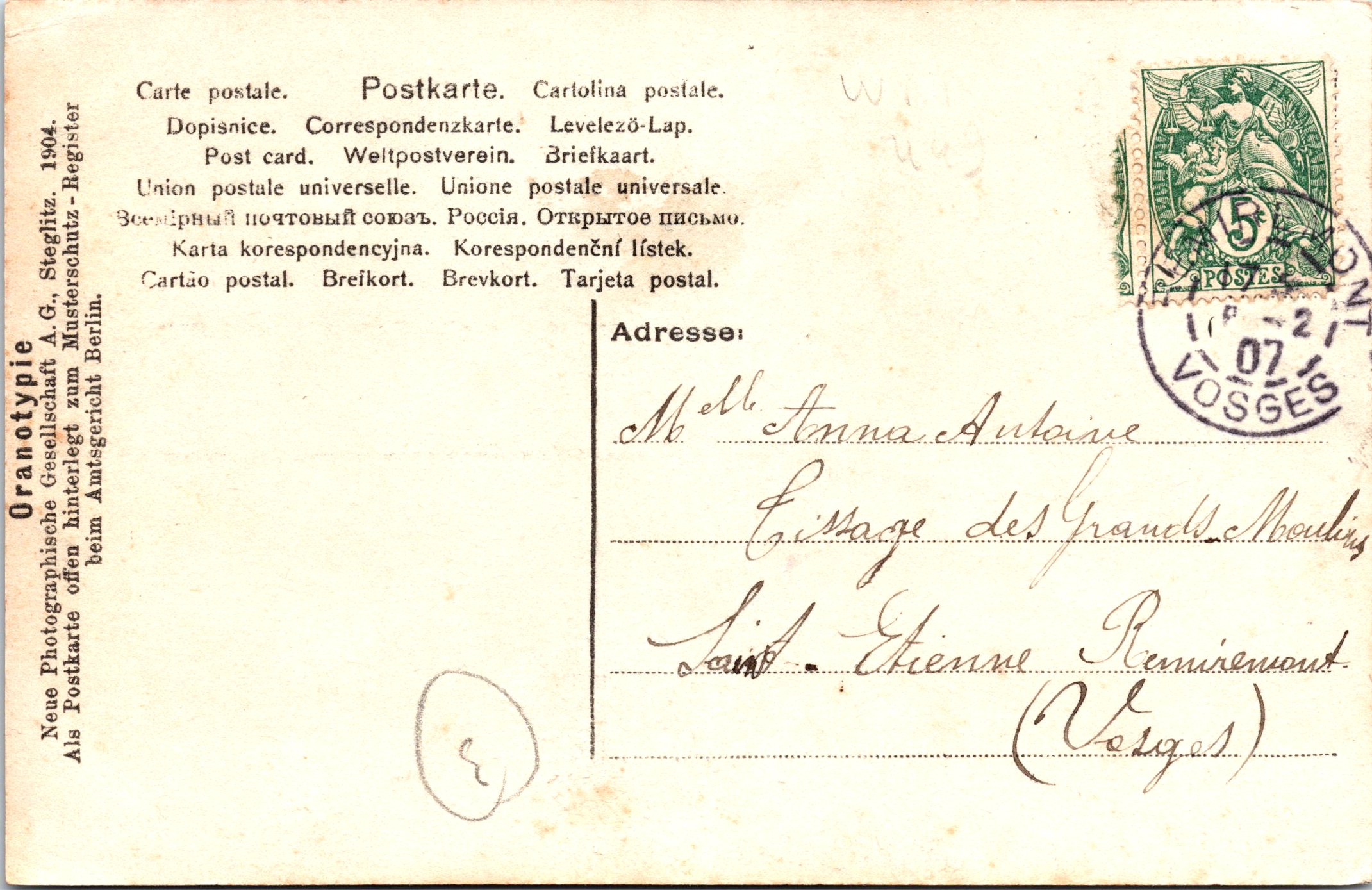 This vintage real photo postcard features American stage and silent film actress, Anna Laughlin (1885-1937). One of her major claims to fame is that she was the first actress to play Dorothy in the Wizard of Oz. She was born in California and began her stage career as a “child elocutionist” (public speaker). At age six, she started acting in vaudeville and later, in touring theater companies. When she was a young teenager, she began appearing on Broadway. In 1900, she was in the Belle of Bohemia and in 1903 she performed in the Wizard of Oz. According to the IBDb, Laughlin appeared in eight Broadway shows between 1900 and 1914. The IMDb reports that Laughlin acted in 14 silent films between 1913 and 1915. She is most well known for her roles in “Northern Lights” (1914), “The Greyhound” (1914), “The Amazing Mr. Fellman” (1915) and “What Happened to Father” (1915). She quit show business in 1915 to focus on raising her daughter. Laughlin was married in 1904 (age about 19) to a jeweler. She was widowed in 1925. Laughlin’s daughter became a noted singer. Anna Laughlin died by suicide in 1937. Her cause of death was gas poisoning. She turned the gas on in her apartment because she was very depressed about being estranged from her daughter. They had previously been very close. According to the IMDb, the following words were found in her three page suicide note. “This is good-bye. People are dreadful. I love my child. I have given all I have in the world to put her where she is now … Lucy is never coming back. I am so afraid. Where did I fail?” This postcard was published in Germany by NPG (Neue Photographische Gesellschaft) as part of a series (no.1098). A. G. Steglitz is also listed as a publisher. The postcard is an “Oranotypie” and was published in 1904. An oranotype is a trade name for a type of glossy real photo postcard published by NPG. The company was a leading bromide photo printing company for many years at the beginning of the 20th century. This card has a French stamp and was postmarked in 1907. SOLD