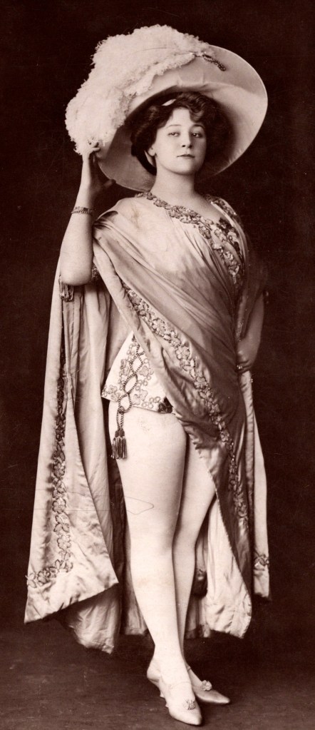 This is a stunning and rare sepia-tone glamour portrait of a woman identified as Mme Le Gai, described on the reverse as a “Pantomimist” and “Vaudevillian.” Believed to date from around 1918, this photograph showcases an elegant, mysterious woman in elaborate costume—perhaps a stage or cabaret performer—gazing confidently into the camera. She wears a richly adorned hat with plumes, a beaded glove-like bracelet, and a delicately embroidered gown with satin and lace textures. Her theatrical pose and sensual expression make this image a prime example of early Hollywood pin-up photography, though its style is also heavily influenced by European cabaret traditions. The handwritten inscription on the back appears to read: “Mme Le Gai / Pantomimist / Vaudevillian.” There is some ambiguity—“Mme” could stand for Madame or Mademoiselle, and the surname may also be interpreted as Le Gai or Le Gaï. The elegant script suggests a deliberate stage name, possibly borrowed from the famed Parisian pantomime houses of the same name. “Le Gai” (French for “the merry” or “joyful”) was also used in naming French performance venues such as Le Théâtre Gai or variations like Le Gai Paris. This connection strengthens the possibility that the subject either performed in or took inspiration from these Parisian theatrical traditions. Though solid biographical confirmation of Mme Le Gai has not yet been found, the visual evidence, style, and inscription point to her role as a vaudeville-era pantomime performer, likely active in the United States or France around World War I. Her alluring presence and costume are consistent with the kind of studio portraiture used for performer promotion, possibly circulated as publicity or collectible pin-up material during the silent film and vaudeville boom.  (SOLD)
