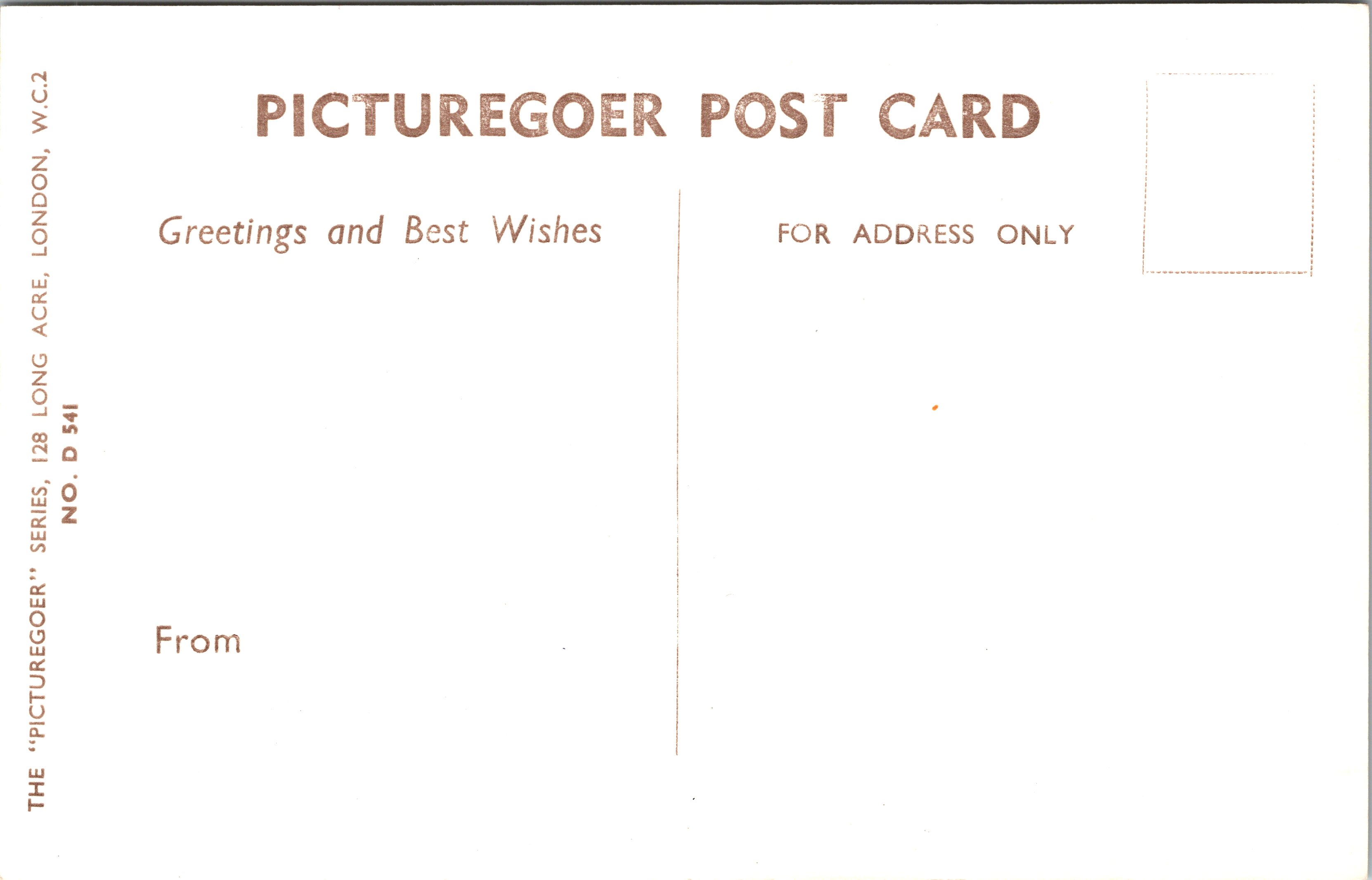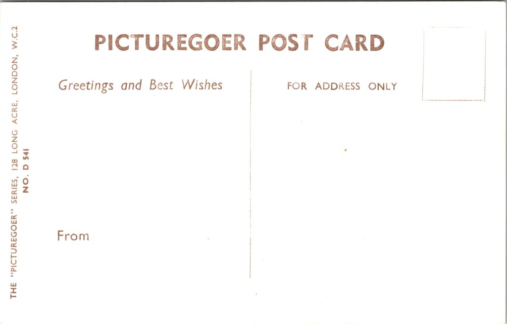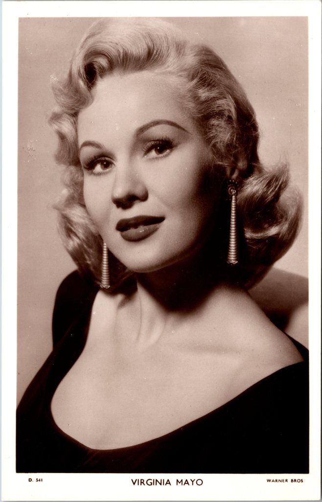 This vintage real photo postcard features American actress and dancer, Virginia Mayo (1920-2005). Virginia grew up in St. Louis. She began attending her Aunt’s acting school at age 6. She also took dancing lessons. She began her professional acting career after graduating high school. She began acting and dancing at the St. Louis Municipal Opera Theatre. She then toured the vaudeville circuit for three years. She appeared in some short films and then was “discovered” performing at a Broadway area night club, by Samuel Goldwyn. Goldwyn appreciated her for her talent as well as her beauty. He signed her to an acting contract with his company.  In 1941, she appeared on the Broadway stage with Eddie Cantor. Her first starring role occured in 1944 when she appeared in a film with Bob Hope. The IMDb reports that Mayo had 70 film credits between 1939 and 1997. She performed in one Broadway play (1941-1942). This vintage postcard is part of the “Picturegoer” series (No. D 541). She posed for the postcard’s portrait while under contract with Warner Brothers.  SOLD