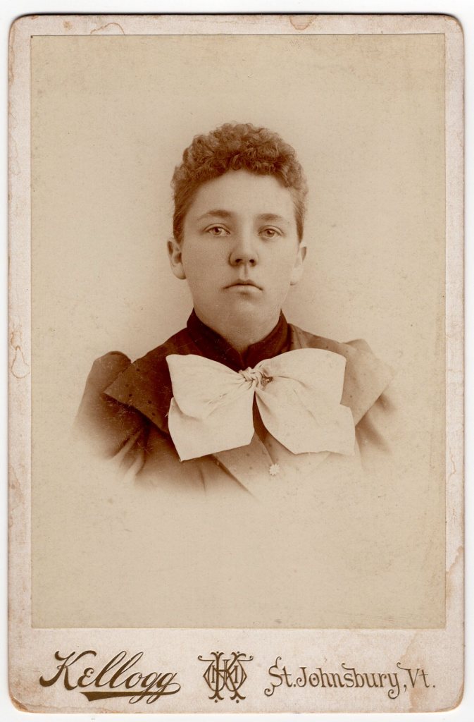 This cabinet card is an image of a young woman with a very large bow on her collar. She has short hair or it is pulled back behind her head. The photographer is Kellogg of St. Johnsbury, Vermont. SOLD