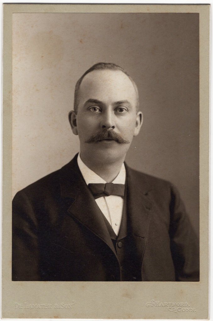 Vermont. The man has an educated appearance emanating from his beard and pince-nez spectacles.Pince-nez are a style of spectacles that was popular in the nineteenth century. These glasses were not supported by ear pieces but instead, stayed on the wearer by pinching on the bridge of his or her nose. The clergyman is wearing a pin near his collar and part of the chain from his pocket watch is visible at the bottom of the image. The Photographic Journal of America (1890) mentions photographer, C. A. Moore of Ludlow, Vermont. He is likely the same Moore that created this image. (SOLD)