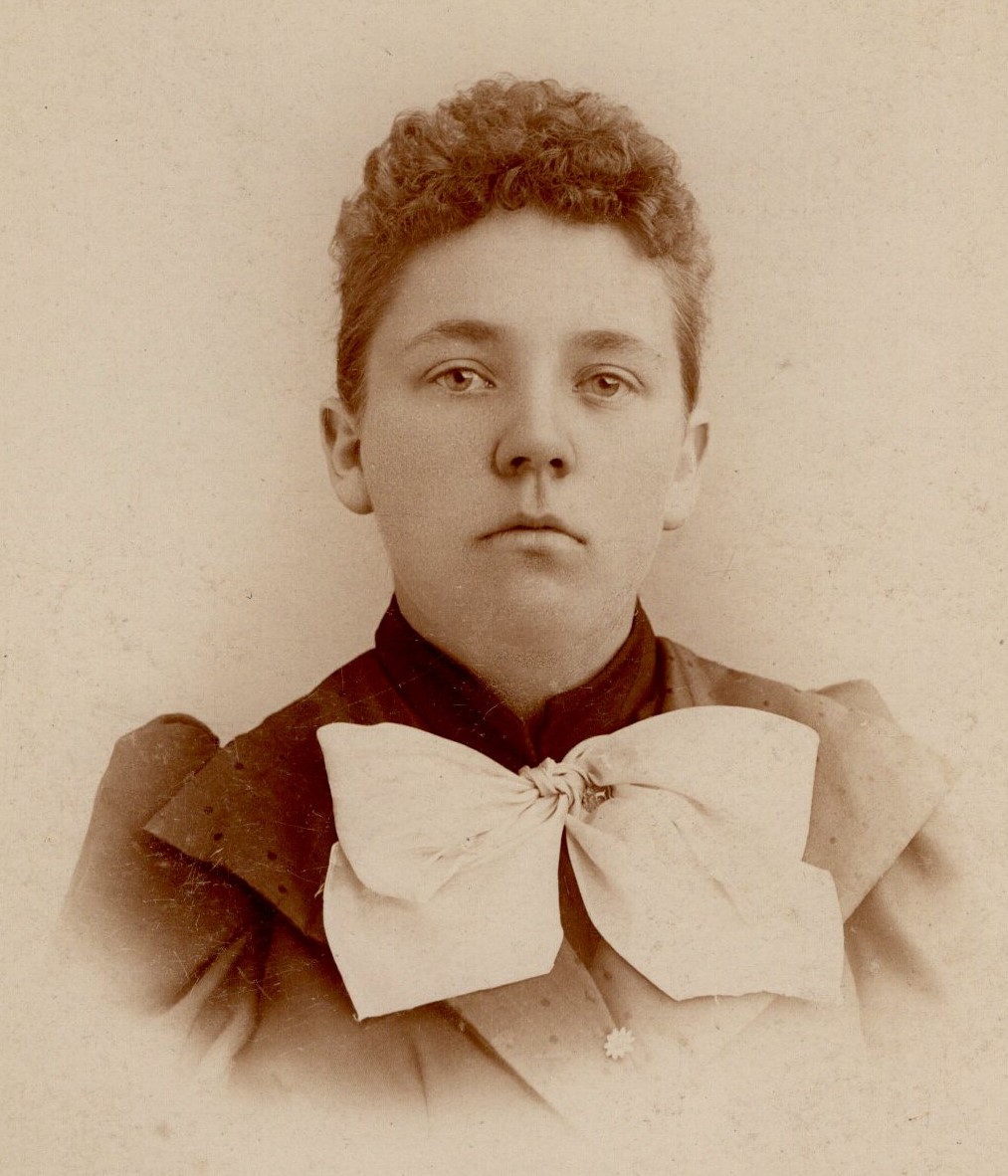 This cabinet card is an image of a young woman with a very large bow on her collar. She has short hair or it is pulled back behind her head. The photographer is Kellogg of St. Johnsbury, Vermont. SOLD