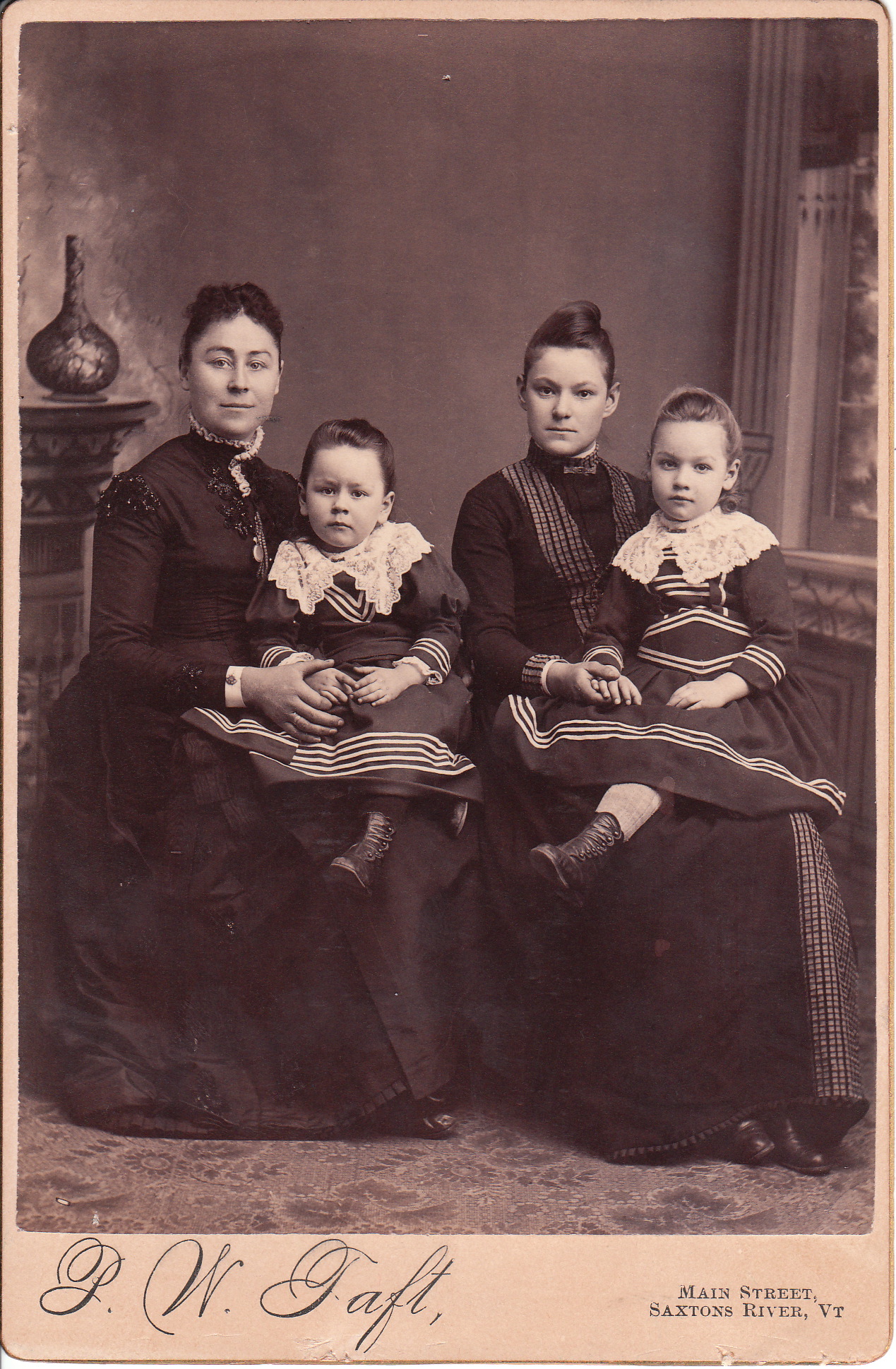 This cabinet card, photographed by P. W. Taft, features two young adult women and two young girls. Perhaps the two older girls are sisters and the two young girls are daughters of the older woman. The family constellation in this image is impossible to determine. It is interesting to note that the two little girls are both wearing dresses styled after a sailor suit. The two dresses are similar, but not identical. Taft’s studio was located in Saxtons River, Vermont. To view other photographs by Taft, click on the category “Photographer: Taft”. Preston William Taft (1826-1901) was listed in the Windham County Business Directory 1884) as having a photography business in Saxtons River. Research reveals that he established a Daguerreotype, and later Photography business in 1856 and operated the studio until 1878. He was married in 1850 to Rose Melissa Miller and the couple had three sons and a daughter. Sons Frank (born 1851), Charles (born 1863), and Edward (born 1868), all became photographers. The daughter’s name was Nettie (born 1865). It is likely that this cabinet card was produced by one of P. W. Taft’s sons since, judging by characteristics of the cabinet card, it was likely photographed after he had left the business. To view other photographs by P. W. Taft, click on the category “Photographer: Taft”. SOLD