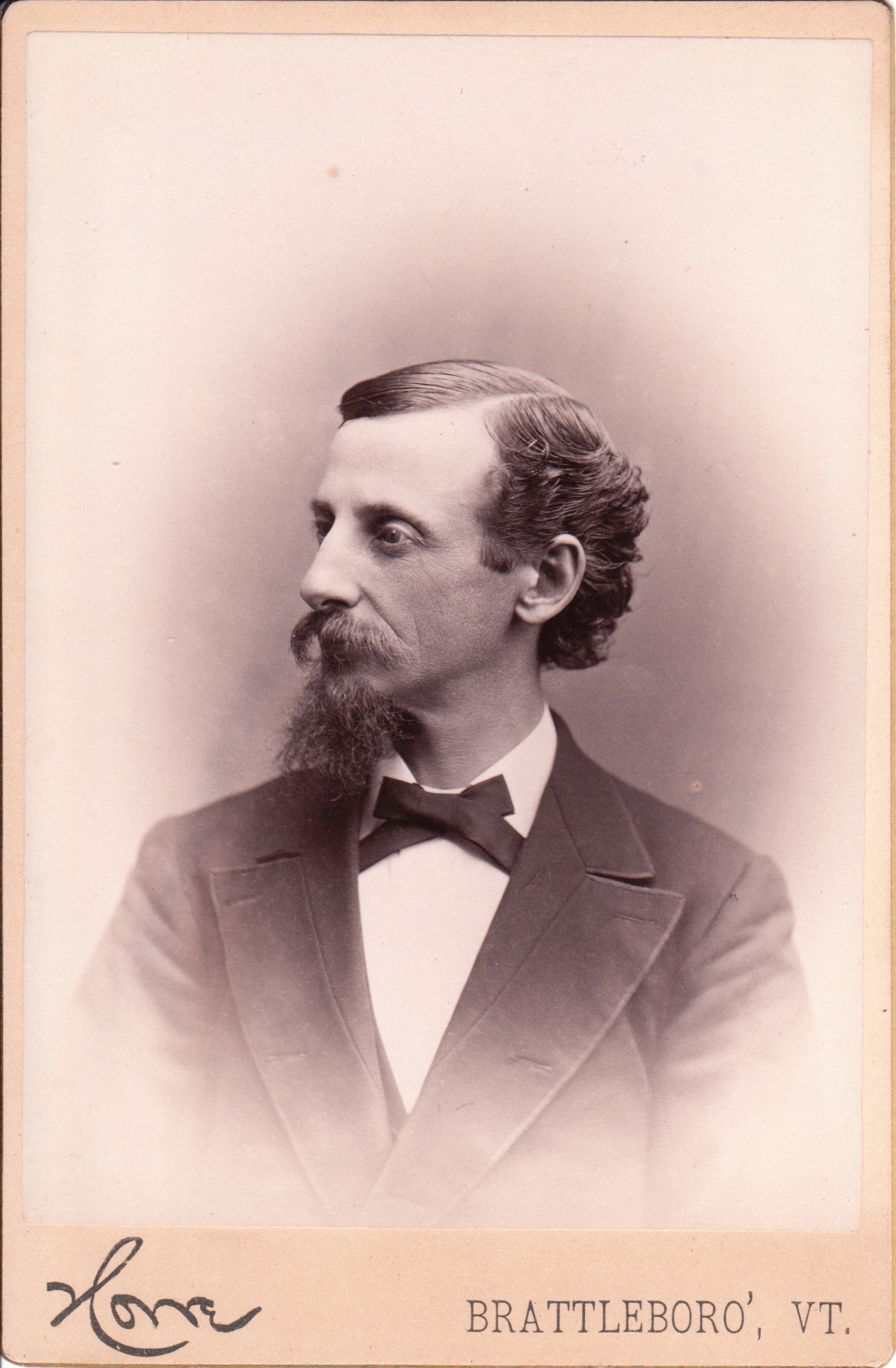 The identity of the gentleman pictured in this cabinet card portrait is Caleb Lysander. The previous owner of this image reported that it comes from an album that makes this positive identification. The subject has an interesting billy goat beard. To view other notable beards, click on the category “Beards (Only the Best)”. The cabinet card was produced by the Howe studio which was located in Brattleboro, Vermont. A Brattleboro history internet site includes a biography and obituary of Mr. Caleb Lysander Howe. The article states that upon his death, his daughter, Mrs Mary Howe-Lavin was informed via cable to Paris where she was performing as a singer. Howe was born in Dummerston, Vermont, in 1811. At age two, he moved with his parents to Dover, Vermont. His father worked as a farmer and had a second business providing transportation between Dover and Boston. Howe worked on the family farm until he was about sixteen when he went to learn a trade as a machinist. At age eighteen he moved to Brattleboro to work in a machine shop. While in the role of machinist, he worked as a watchmaker and producer of jewelry. He married Miss Cynthia Sherman who was from Dover. In 1838 he leased a farm in Dover. He became interested in photography in about 1846 and soon purchased a photography studio where he started out producing daguerreotypes. He then purchased a four wheel car for three hundred dollars and added traveling photographer to his job description. He did most of his work within his county. It is reported that he made a profit of between one hundred and two hundred dollars a month. He came to Brattleboro in 1856 and purchased a photography gallery. He became quite successful as a photographer. In 1880 his son, John C. Howe became associated with the business and the studio became known as C. L. Howe & Son. The senior Mr. Howe was highly regarded throughout the county as a teacher of vocal music and as a tenor singer. He died in 1895. There is a possibility that this is a self portrait. In other words, Caleb Lysander Howe may be the subject and the photographer. Research found an engraved portrait of Howe that looks similar to this cabinet card image. As a side note, research found a number of references to C. L. Howes prima donna daughter. The book “Picturesque Brattleboro: With Over Two Hundred Illustrations (1894) describes Mary Howe-Lavin as a “beautiful songstress” and states that “there is something indescribably fascinating in the singing and personal appearance of this charming woman”. References reveal that she performed in a number of major cities in Germany. Her second wedding was announced in the New York Times (1905). (SOLD)