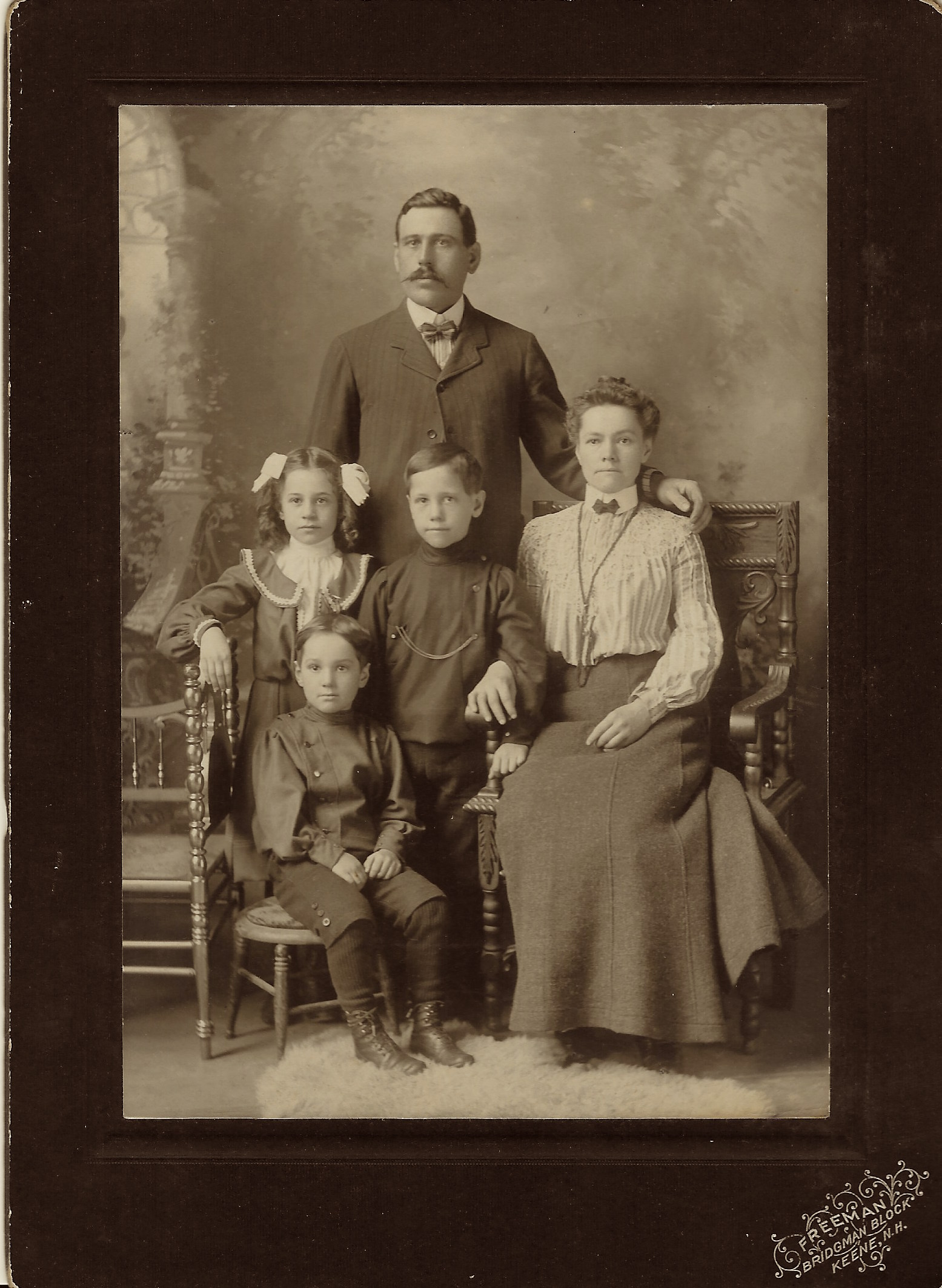 Amos Rheaume and his family pose for their portrait at the studio of W. G. Freeman in Keene, New Hampshire. Amos and his wife and three children comprise an attractive family. W. G. Freeman was a photographer in Keene between 1901 and 1905. At some point he moved his business to Bellow Falls, Vermont where he appears in city directories from at least 1910 through 1918. (SOLD)