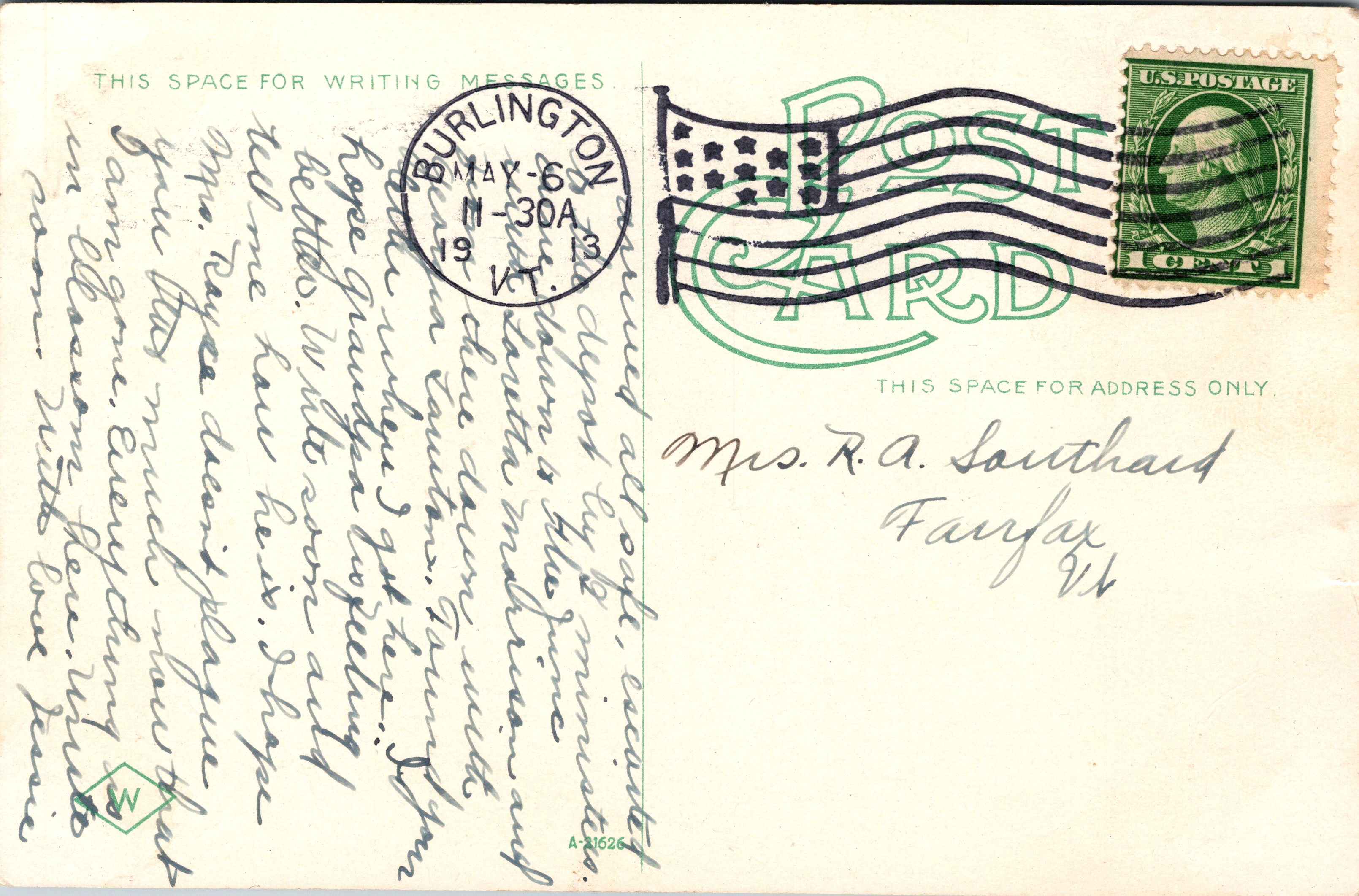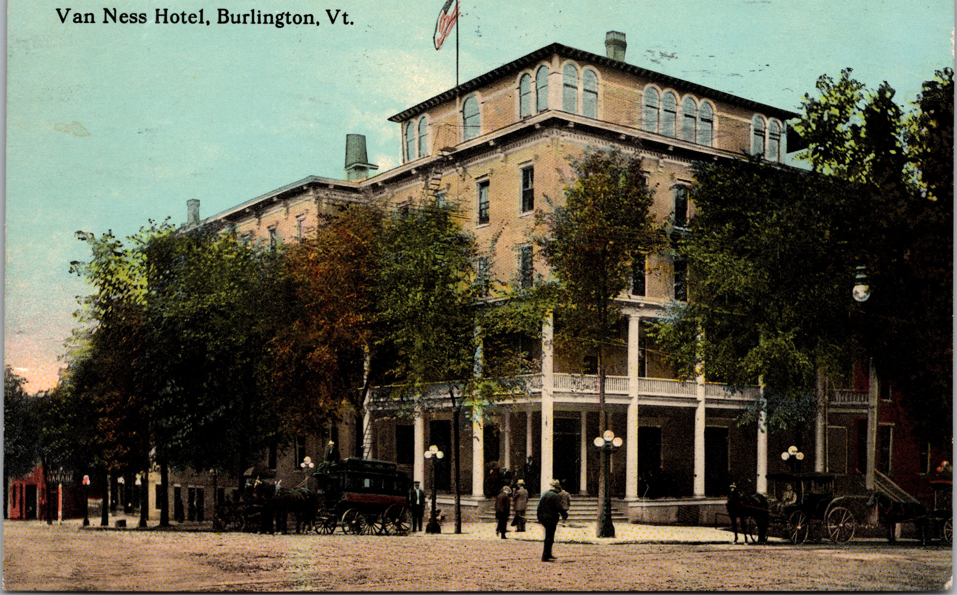 This vintage postcard features the Van Ness Hotel, which was located in Burlington, Vermont. Also pictured are three horse drawn coaches and several pedestrians. The Van Ness opened in 1870.The brick building was on the site formerly occupied by the Howard House until it was destroyed by fire in 1867. The Van Ness Hotel had a capacity of 400 guests. It hosted three US Presidents (William McKinley, Theodore Roosevelt, and Howard Taft). The Van Ness was considered “first class” and the best hotel in Burlington. The Van Ness burned down in 1951. When a new building went up on the site, it was occupied by the Howard Bank. In 2007, it became the TD Bank. The postcard has a 1913 postmark from Burlington. The card is in good condition. Note the small dent near the middle of the left edge of the front of the postcard.