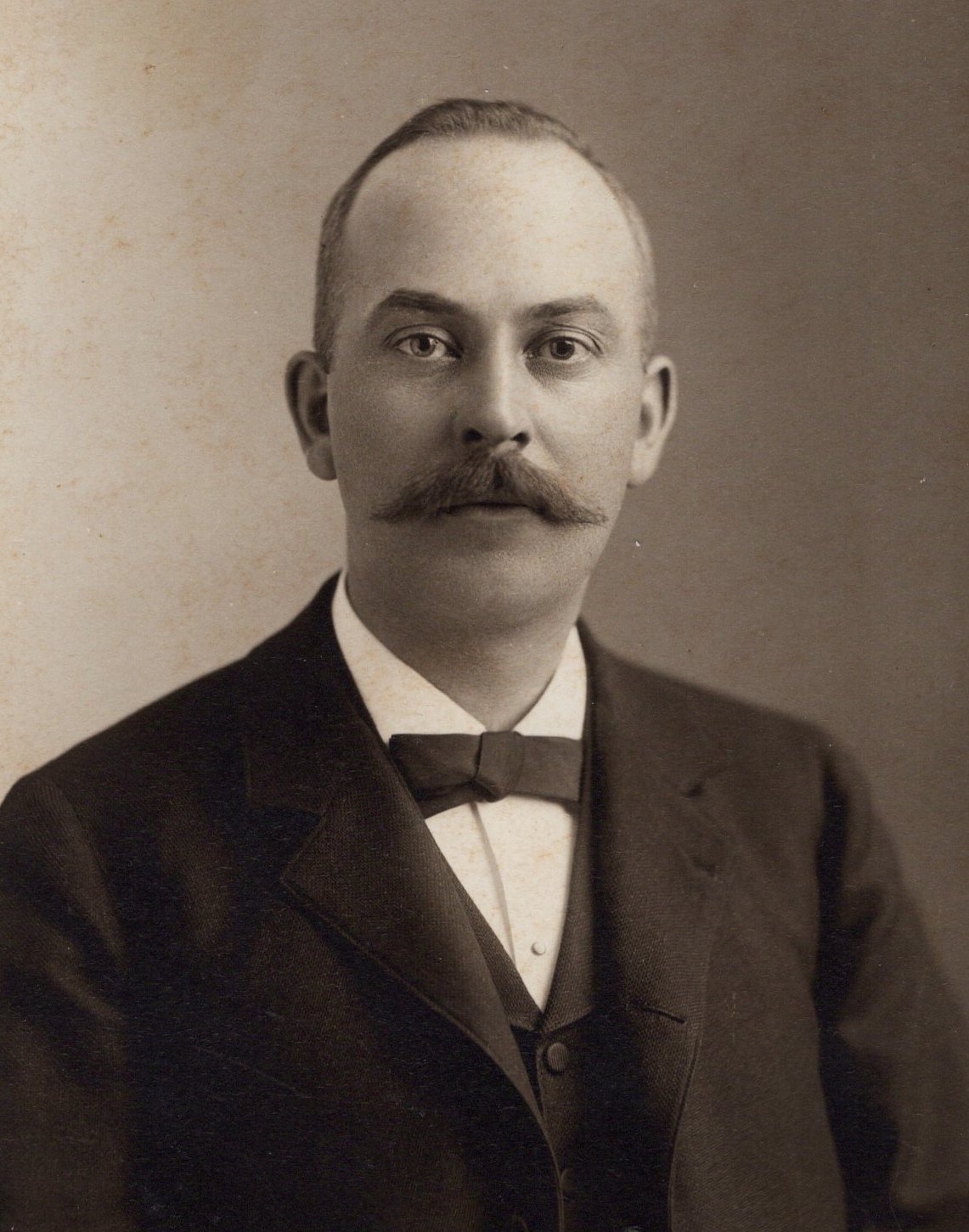 Vermont. The man has an educated appearance emanating from his beard and pince-nez spectacles.Pince-nez are a style of spectacles that was popular in the nineteenth century. These glasses were not supported by ear pieces but instead, stayed on the wearer by pinching on the bridge of his or her nose. The clergyman is wearing a pin near his collar and part of the chain from his pocket watch is visible at the bottom of the image. The Photographic Journal of America (1890) mentions photographer, C. A. Moore of Ludlow, Vermont. He is likely the same Moore that created this image. (SOLD)