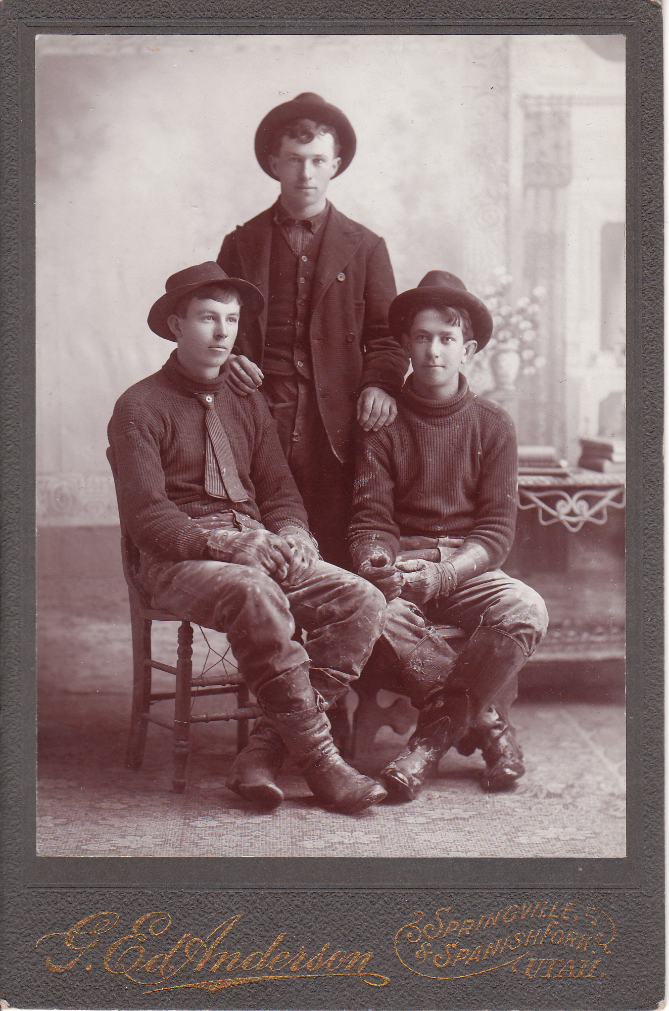 Three young men pose for their portrait at the studio of G. Ed. Anderson, located in either Springville, or Spanish Fork, Utah. The guys may have come to the studio after work. The two seated men are wearing work boots and work gloves. They are also wearing dirty trousers. Interestingly, one of the guys is wearing a turtleneck, a garment not seen often in cabinet card photographs. An inscription on the reverse of the card identifies the men as Saul Clyde, Will Rowland, and John Whiting. It would be interesting to hear some of this sites visitors opinion as to what occupation these men may have occupied. Please leave a hypothesis if you have one. Photographer, George Edward Anderson (1860-1928) was a noted photographer for his portraiture and documentary photographs of early Church of Jesus Christ of Latter-day Saints temples. He was born in Salt Lake City, Utah and was a photographer apprentice to renowned photographer Charles Roscoe Savage. At age seventeen, Anderson established a photography studio in Salt Lake City with two of his brothers. He then established a studio in Manti, Utah and in 1886, he moved his studio to Springville, Utah. Anderson became well known for his traveling tent studio which he set up in small towns throughout central, eastern and southern Utah. During that time he did an excellent job of documenting the lives of residents in the years 1884 to 1907. Although best known for his portraits, Anderson took many documentary photographs of homes, barns, businesses, Temples, mines and railroads. He went to England on his Church of Latter Day Saints mission in 1909 to 1911. After his mission, he set up a photography studio in South Royalton, Vermont, which is near the birthplace of LDS prophet Joseph Smith. In 1913, he returned to his home and family in Springville. He returned to financial and marital problems and tried to revive his traveling tent studio but met little success. The later years of his life were spent documenting families and life in Utah Valley and traveling to photograph newly constructed temples. Anderson received most of his recognition long after his death. A collection of his works is housed at Brigham Young University library.