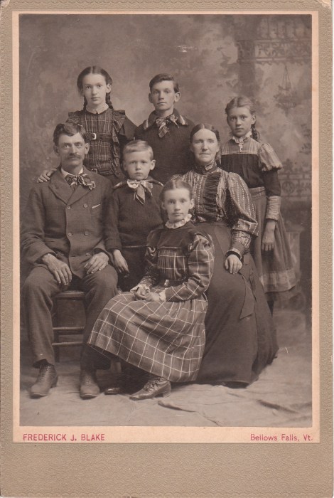 This cabinet card features at attractive family posing for their portrait at the studio of Frederick J. Blake, in Bellows Falls, Vermont. Mom and Dad are accompanied by their two sons and three daughters. Blake is listed in the Windham County Business Directory (1884).