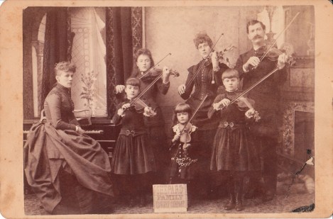 This cabinet card features a portrait of the Shepard Family Concert Company. In this photograph, mother is playing the piano (or organ) and the five children and their father are playing violins. The photographer of this cabinet card is unknown, as is the location of the studio. A photograph of the Shepard family and their instruments appears in The Henry Sheldon Museum of Vermont (located in Middlebury, Vermont). In addition, the museum possesses a “cigar ribbon quilt” serving as a piano cover. The quilt is made from silken advertising ribbons which cigar companies used to tie cigars together for packaging purposes. This particular quilt was made by Mary Emily Shepard (“Minnie”), the matriarch of the Shepard Family. The Shepard Family was Massachusetts based, and mostly toured upper New England. The musical group venues included the Town Hall Theatre, in Middlebury, Vermont. Family Musical Troupes were popular in the 1880’s and 1890’s. Mr. and Mrs. J. M. Shepard and their children, Kittie, Laura, Lessie, Georgie, and Burtin were regionally well known and appreciated in the late nineteenth century. Each family member were multi instrumentalists. The family could perform as a choral group, a brass band, or a violin ensemble with the mother playing the pump reed organ. In addition, sometimes, the children would perform as a banjo quintet.