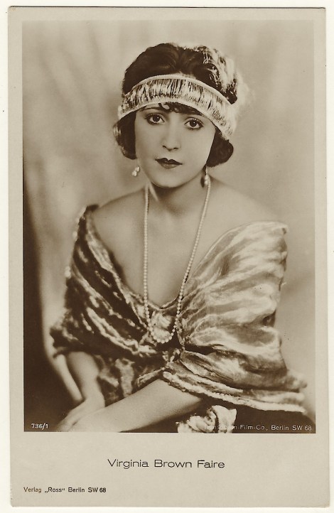 This vintage real photo postcard features American silent and sound film star, Virginia Brown Faire (1904-1980). She was born in Brooklyn, New York. In 1919, after being a winner of the Motion Picture Classic magazine’s “Fame and Fortune” contest, she went to Hollywood. At age 15, she was hired by Metro studio. She then appeared in movies for Fox, followed by Universal. Her first film “Runnin’ Straight” (1920) was a Hoot Gibson short western. She was the leading lady for John Gilbert in Monte Cristo (1922). She was chosen as one of the WAMPAS Baby Stars in 1923. Included in this group of beautiful actresses was Laura La Plante and Evelyn Brent. La Plante and Brent both had successful acting careers. She is most remembered for her role as Tinker Bell in Peter Pan (1924). Faire made a successful transition into sound films. Her first successful talkie was her role in Frank Capra’s “The Donovan Affair” (1929). She appeared in several westerns. Among the western stars that she played opposite to; was John Wayne,Hoot Gibson, and Buck Jones. In the late 1930’s she left Hollywood and moved to Chicago and worked in radio and industrial films. She retired in about 1935. According to the IMDb, she appeared in 74 films between 1920 and 1935. Faire had three marriages. The first, was to actor Jack Dougherty and the marriage lasted just over a year. She then married director Duke Worne, a film director. He died after three years and she then married William Bayer, a furniture manufacturer. She died of cancer in 1980. This vintage postcard was published by Ross Verlag of Berlin, Germany. It is part of a series (no, 736/1). SOLD