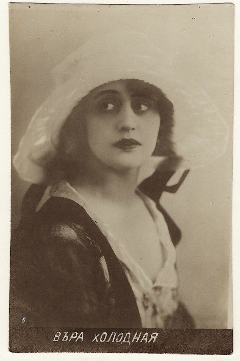 This vintage real photo postcard features Russian actress Vera Vasilyevna Kholodnaya (1893-1919). Sometimes she is referred to as Holodnaja). She was the first star of Russian silent film. The number of films that she appeared in, is unknown. It is estimated the number of appearances is somewhere between fifty and one hundred. It is unfortunate that only five of her films survived the passage of time. She was born in Poltava which was part of the Russian Empire, and is now located in the Ukraine. At the age of two, she moved to Moscow to live with her grandmother. As a child, she fantasized about becoming a classical ballerina. She eventually enrolled in the Bolshoi Theatre ballet school From early childhood, she participated in family theater productions, While attending her school prom to celebrate her graduation she met Vladimir Kholodny, whom she married in 1910. He is known as one of Russia’s first race car drivers. The pair had two children. In 1908, after seeing actress Vera Komissarzhevskaya in a stage role, she decided that she wanted to pursue a career in films. She sought out Vladimir Gardin, a major Russian film director, and he gave her a minor role in Anna Karenina. In 1915, film director Yevgeni Bauer was searching for an actress who possessed great beauty. After meeting Vera Kholodnaya, he found the enchantress that he was looking for. Bauer’s film was a resounding success. He then made a second film starring Kholodnaya. These two Bauer films made Vera a major celebrity. She soon became known as “the Queen of Screen” and had great successes with other films. By 1918, she was a film phenom. When Russia entered World War I, her husband joined the military. She participated in charity concerts to support the soldiers and their families. It is reported that she was “worshipped” by soldiers. By the time of the Russian Revolution (1917), a new Kholodnaya film was released every three weeks and she continued to experience acclaim and success. Around this time, the actress moved with her film company to Odessa. She died there, at age 25, during the 1918 flu pandemic.This version of the flu, was known as the “Spanish Flu” and it infected 500 million people around the world between 1918 and 1920. Estimates are that between 50 and 100 million people died during the pandemic. (SOLD)