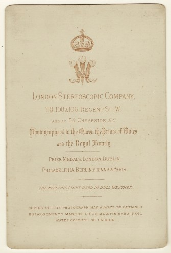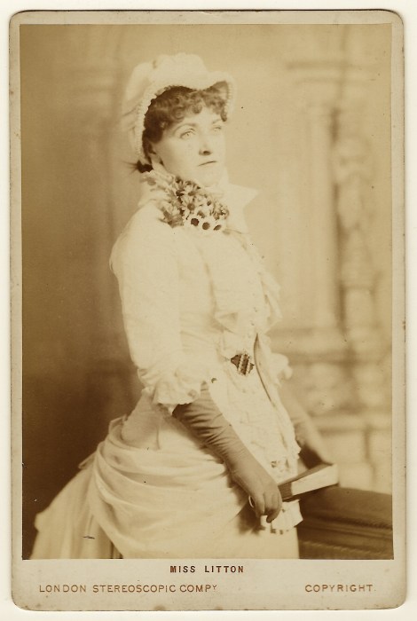 This cabinet card portrait features Victorian actress and theater manager, Marie Litton (1847-1884). She was born in England. She began her stage career in 1868, and by 1871 she became an actor-manager. She produced plays at the Court Theatre for four years. Several of these plays were by celebrated dramatist, W. S. Gilbert. She also appeared in and managed other West End theatres. Her better known roles include her appearances in “The School for Scandal” (1877), “The Rivals” (1878), and “She Stoops to Conquer” (1879). Litton had a long affair with theatre manager, William Wybrow Robertson (1831-1908). The pair married in 1879 after Robertson’s wife died. In 1882, Litton was forced to retire because of her cancer, which would eventually cause her death. Her obituary in “The Era” praised her for her generosity and helpfulness to others in the theatre profession. The article states that she was held in high esteem by both fans and by those who knew her in her private life. Miss Litton’s portrait was taken by the London Stereoscopic Company. The London Stereoscopic Company was located, not surprisingly, in London, England. The gallery billed itself as “Photographers’ to the Queen, the Prince of Wales and the Royal Family”. The company won many prizes and international exhibitions. (SOLD)