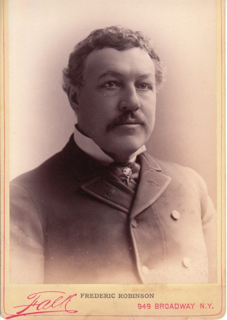 Fredric Robinson (1832-1912) is featured in this cabinet card by Falk, of New York City, New York. Robinson was an English theatrical performer who played York, Liverpool, and finally had his debut in London in 1851. In 1865 he was engaged by Lester Wallack to perform in America. He played Boston between 1868 and 1870. He later played in many of the major cities in the United States, including New York, San Francisco and Chicago. Robinson was an avid fisherman and he was known to travel with fishing tackle that was worth more than a thousand dollars. The photographer of this cabinet card, Falk, was a celebrated photographer of celebrities. To see other photographs by Falk in the Cabinet Card Gallery; click on the category “Photographer: Falk”.