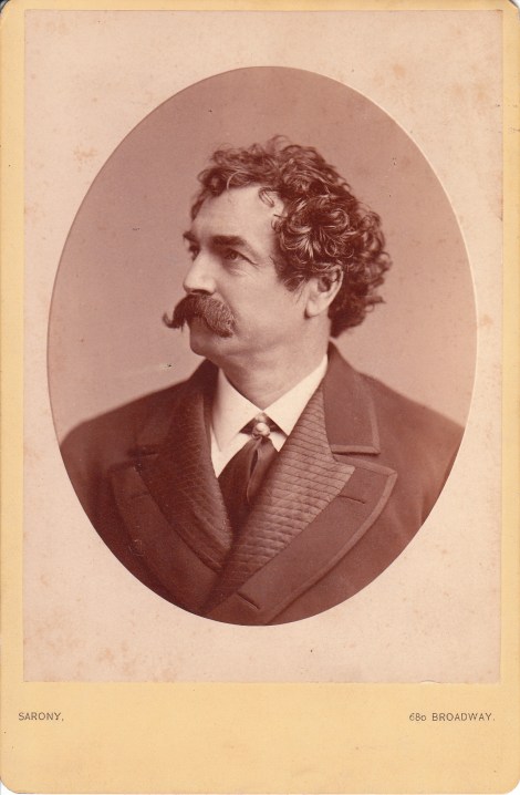This Cabinet Card was published by celebrity photographer, Napoleon Sarony. His studio was located in New York City. The subject of this portrait is actor, playwright, and theatre manager, John Lester Wallack (1820-1888). Wallack was born into a theatrical family. Wallack served in the British Army before appearing on the Dublin and London stage. His first stage appearance in New York was in 1847 in Boucicault’s adaptation of “Used Up.” Wallack became what many consider, the leading light comedian on the American stage. His autobiography, “Memories of Fifty Years”, was published in 1889. To view other photographs by Sarony, click on category “Photographers: Sarony”. To view other actors, click on category “Actor”. (SOLD)