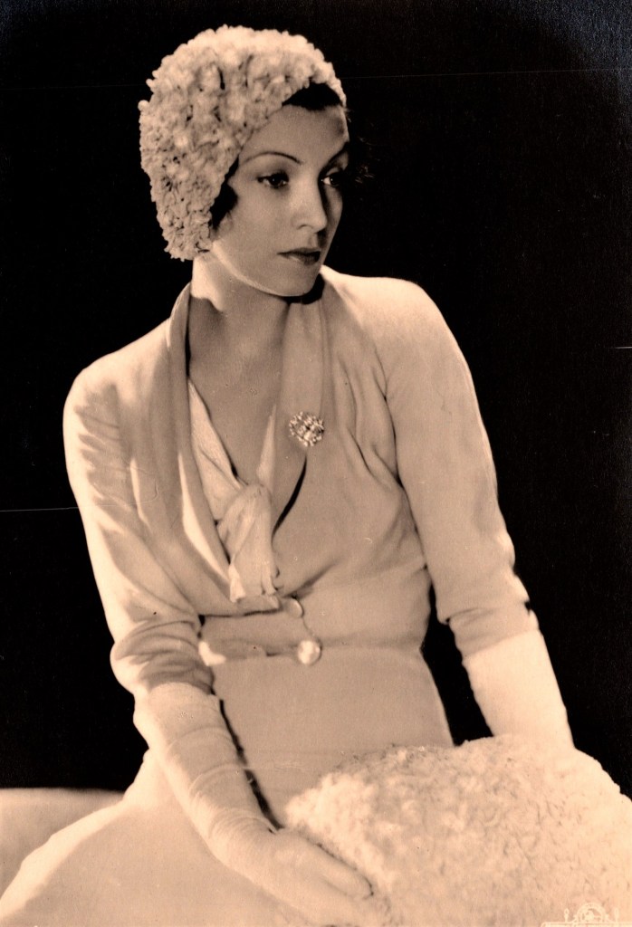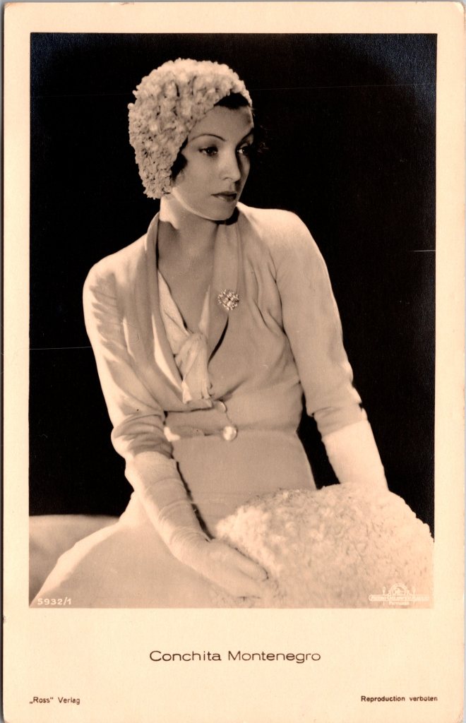This vintage real photo postcard features Spanish model, dancer, and stage and screen actress, Conchita Montenegro (1911-2007). Montenegro learned classical and Spanish dance as a child. She is remembered for revolutionizing Spanish Dance. She transitioned to dramatic acting and starred in a number of productions. By the time she reached 13 years of age, she was famous in Hollywood, France, and Germany. She started in Hollywood with a contract with Metro Goldwyn Mayer. She began her film career in Spanish language versions of MGM movies. She quickly moved into American movies and her fame grew. In 1931, she left MGM for Fox Films. That same year, while on the way to shoot “The Cisco Kid” in Tucson, Arizona; she and many of the film crew and actors were involved in a serious train crash (derailment). In 1931, Fox named three of it’s actresses as “Fox debutante stars” and vowed to do so annually. Montenero, Helen Mack, and Linda Watkins were in the first trio that Fox honored as most likely to achieve stardom. Fox was competing with “WAMPAS Baby Stars” in forming this group of future stars. At times, Montenegro would perform at premiers of new films. She was able to showcase her multi talents, including vaudeville acts, at these shows. The IMDb credits Montenegro with 39 film appearances between 1927 and 1944. She played Lola Montes in the 1944 biopic. This vintage postcard was published by Ross Verlag as part of a series (No.5932/1). Note the logo for Metro Goldwyn Mayer in the bottom right hand corner of the image. Since Montenegro worked for MGM around 1930, she must have been around 19 years old when this photograph was taken. This postcard is in very good condition (see scans).