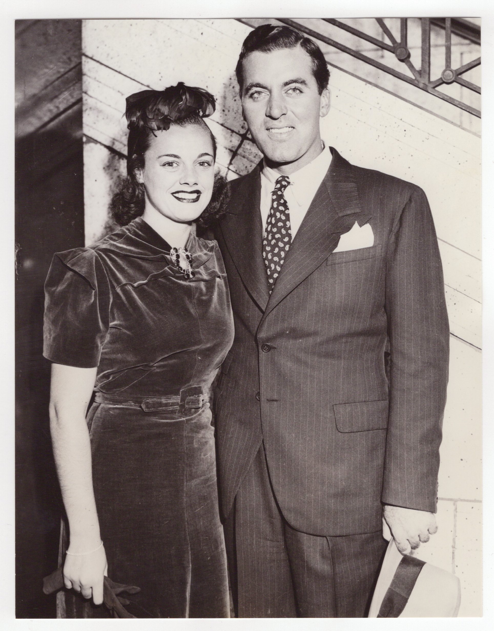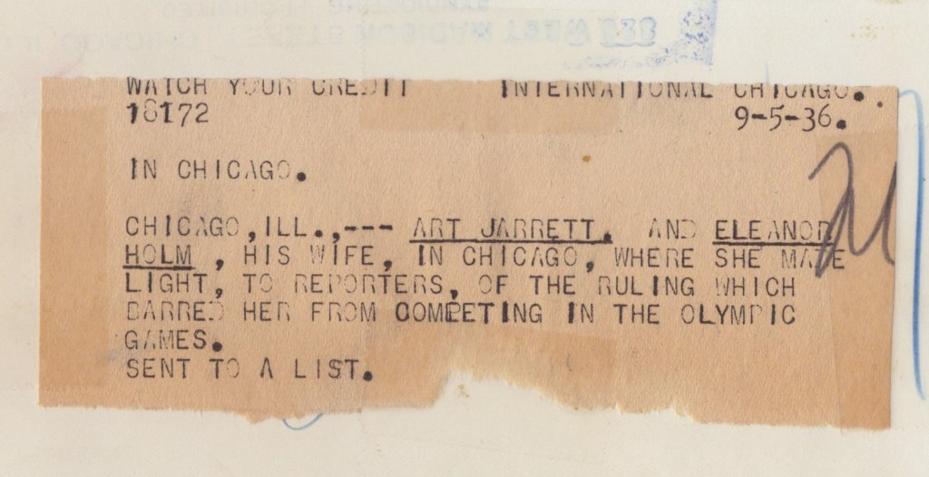 This vintage press photo (1936) features Eleanor Holm (1913-2004), an accomplished American swimmer and Olympian. She participated in the 1928 and 1932 Olympics. In 1932 she won a gold medal in the backstroke. She was selected to the 1936 Olympic team but was expelled from the team by Avery Brundage, President of the American Olympic Committee. On the way to the Olympics, Eleanor attended a drinking party aboard the ship that was taking her and her fellow athletes to Europe. Apparently she drank way too much. The team doctor found her in a near coma state. She also had been rude to a team chaperone. There were a number of charges; Eleanor did not deny them. Later in time, she stated that Brundage had a grudge against her because she had rejected him after he propositioned her. She ended up watching the swim events from the stands. Eleanor appears to have liked the limelight. In 1932, shortly after the Olympics, she had screen tests at a number of Hollywood’s major studios. That same year, she was named a WAMPAS baby star in the same class as Ginger Rogers. One of her first jobs with Warner Brothers involved barnstorming the country supporting both the movie “42nd Street” as well as the newly elected president, Franklin Roosevelt. In 1933 she married Art Jarrett (pictured in this photo), a singer and bandleader at the Cocoanut Grove nightclub. Holm appeared in four films playing herself and in one feature film, “Tarzan’s Revenge” (1938). Holm’s husband divorced her in 1938 1938. He stated he was humiliated by Holm’s expulsion from the Olympics as well as her having an affair. Holm married impresario Billy Rose in 1939. He had just divorced Fanny Brice. Also in 1939, Holm performed in Rose’s “Acquacade” at the World’s Fair. Holm’s marriage to Rose ended in 1954 in divorce. The divorce trial was sensational and was labelled “The War of the Roses”. Some months post divorce, Holm married again. Her new husband was an oil executive. SOLD