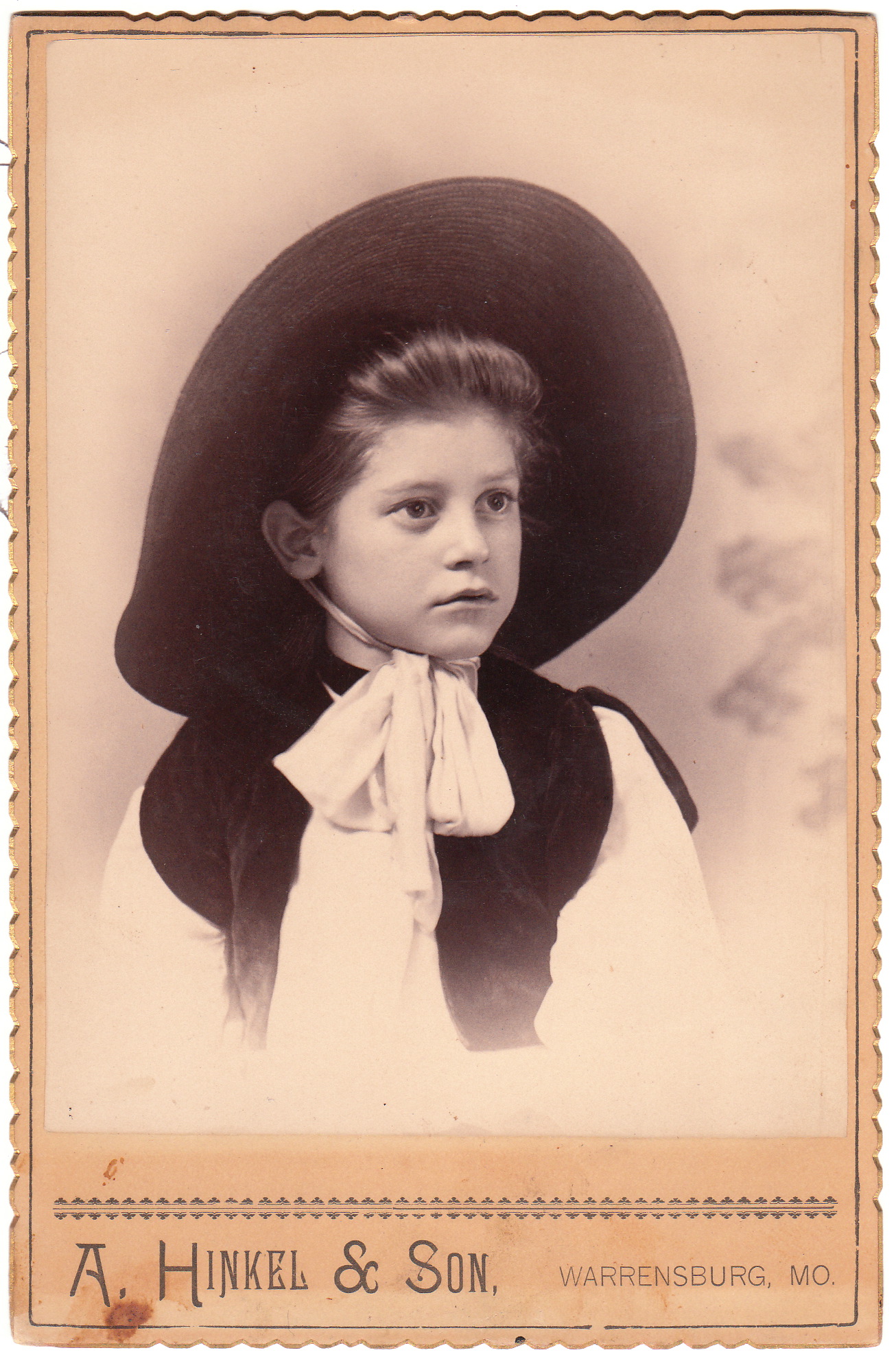 This cabinet card portrait features a young girl wearing a big hat. She is very cute. She is also wearing a big bow. The portrait of this child was taken at the studio of A. Hinkel & Son in Warrensburg, Missouri. Inscribed on the verso of this photograph is the girls name and age, “Bessie Strodes Aged 9 years”. Preliminary research did not find find much information about little Miss Strodes. The 1910 US census listed a Bessie Strodes that resided in Kansas, Missouri (58 miles from Warrensburg). She was born in 1894 and at the time of the census was a sixteen year-old lodger working as a saleslady in a drug store.No information was located concerning the photographer, A. Hinkel.