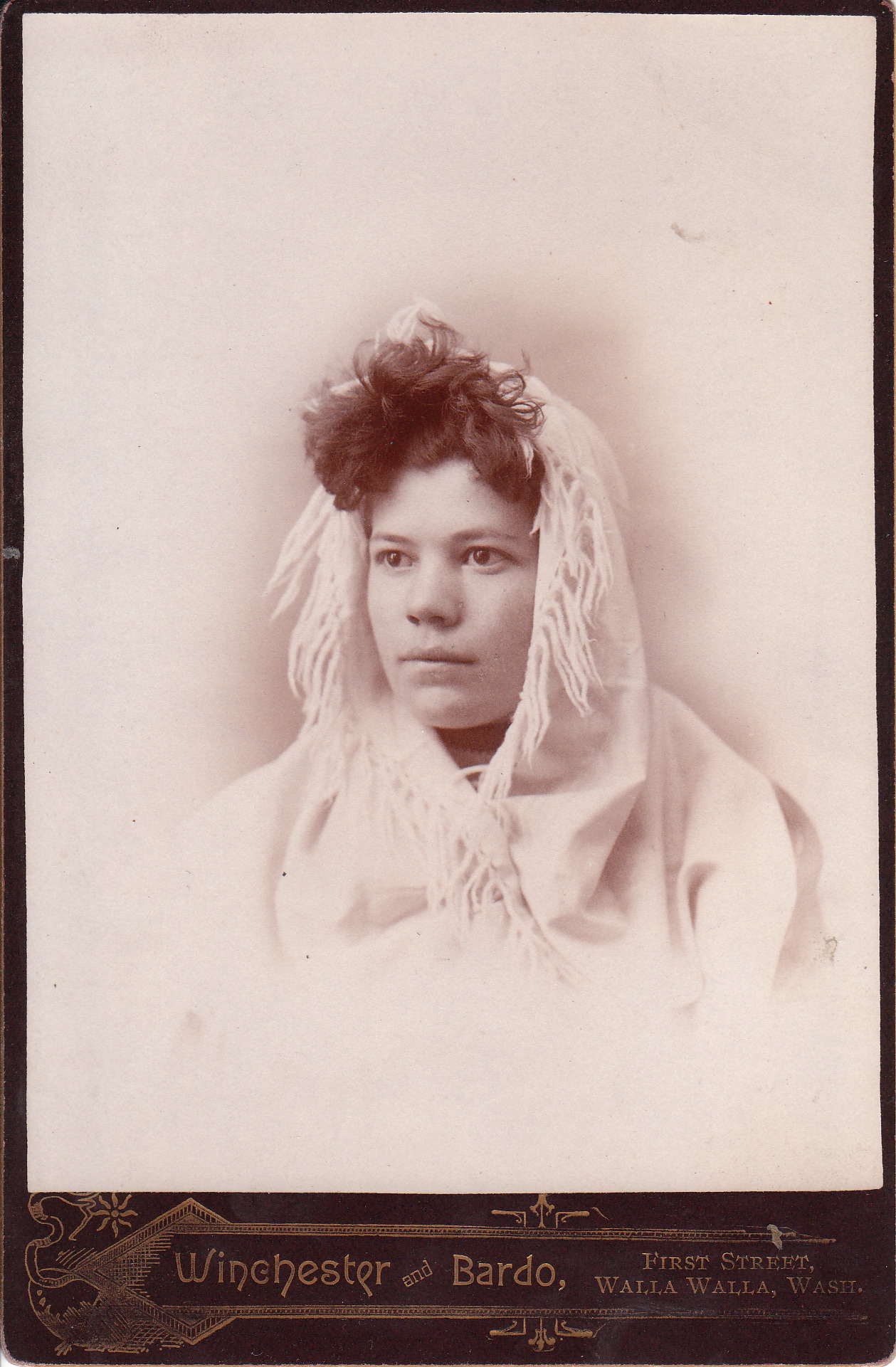 She woke up in the morning and looked in the mirror. “Oh no”, she exclaimed! “I’m supposed to go down to Winchester and Bardo’s studio for a cabinet card portrait and I am having the worst hair day of my life”. Always a quick thinker, she took her shawl out of her bedroom chest of drawers, and placed it strategically over her head, covering most of her wild locks of hair. She looked in the mirror, exited the front door, and with some apprehension, walked to the photography studio on First Street, in Walla Walla. On the way to the photographer, she was approached by an inquisitive out of town visitor who asked her why the town was called Walla Walla. She explained to the visitor that proud Walla Walla residents like to say that their town was so nice, that they named it twice. She added that if the truth be told, Walla Walla is a Native American expression for “place of many waters”. (SOLD)