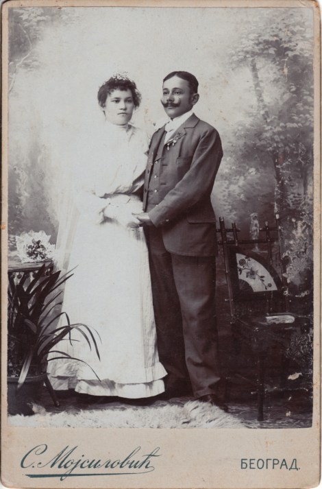 This Cabinet Card is a wedding portrait of a bride and groom in Beograd, Serbia. Beograd is Belgrade, the capital of Serbia. The photographer was Mojsilovic. The groom is wearing a three piece suit, flowers on his lapel and a mustache which curls upward. The bride has flowers in her hair and appears to be wearing white gloves. There is a bouquet of flowers on the table next to the bride.