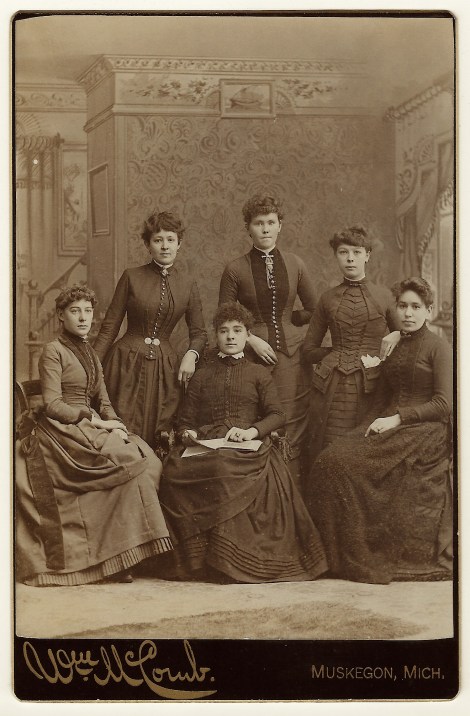 Six young women gathered at the studio belonging to William McComb (1844-?) in order to have their photograph taken. The studio was located in Muskegon, Michigan. What is the connection between these women? The woman seated in the center front row of the photo has an open book on her lap. Perhaps the young ladies are students. More is known about the photographer than about the young women. William McComb grew up on Prince Edward Island, Canada. He was of Irish descent. By the time he was fifteen years old, McComb had developed an interest in photography. In 1859, he volunteered to become the assistant of a visiting photographer in the area. He learned the business and photography skills necessary to pursue the career of being a photographer. His career path took him to jobs in galleries in Ottawa and Montreal. He then moved to the United States where he met Muskegon photographer, J. D. Westervelt. The two men decided to work together, and the partnership lasted for just one year. In 1879, McComb opened his own photo studio. He soon became the most popular photographer in Muskegon. In 1895, a devastating fire destroyed his studio and it’s equipment as well as his collection of 40,000 negatives. McComb opened a new studio and rebuilt his business. Besides photography, he had a strong interest in weather forecasting and in 1893, he joined the US weather bureau. His duties included raising flags to notify mariners of approaching weather conditions. A photo of William McComb can be seen below. This cabinet card has gold beveled edges. SOLD