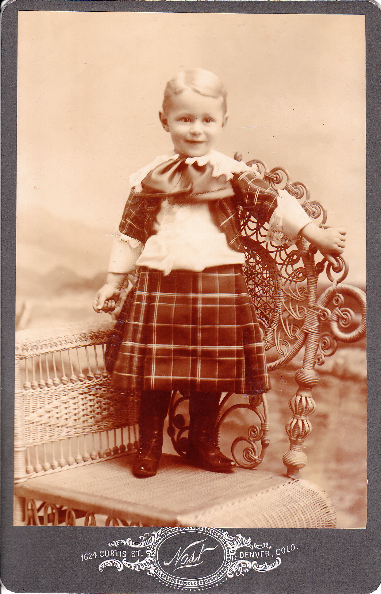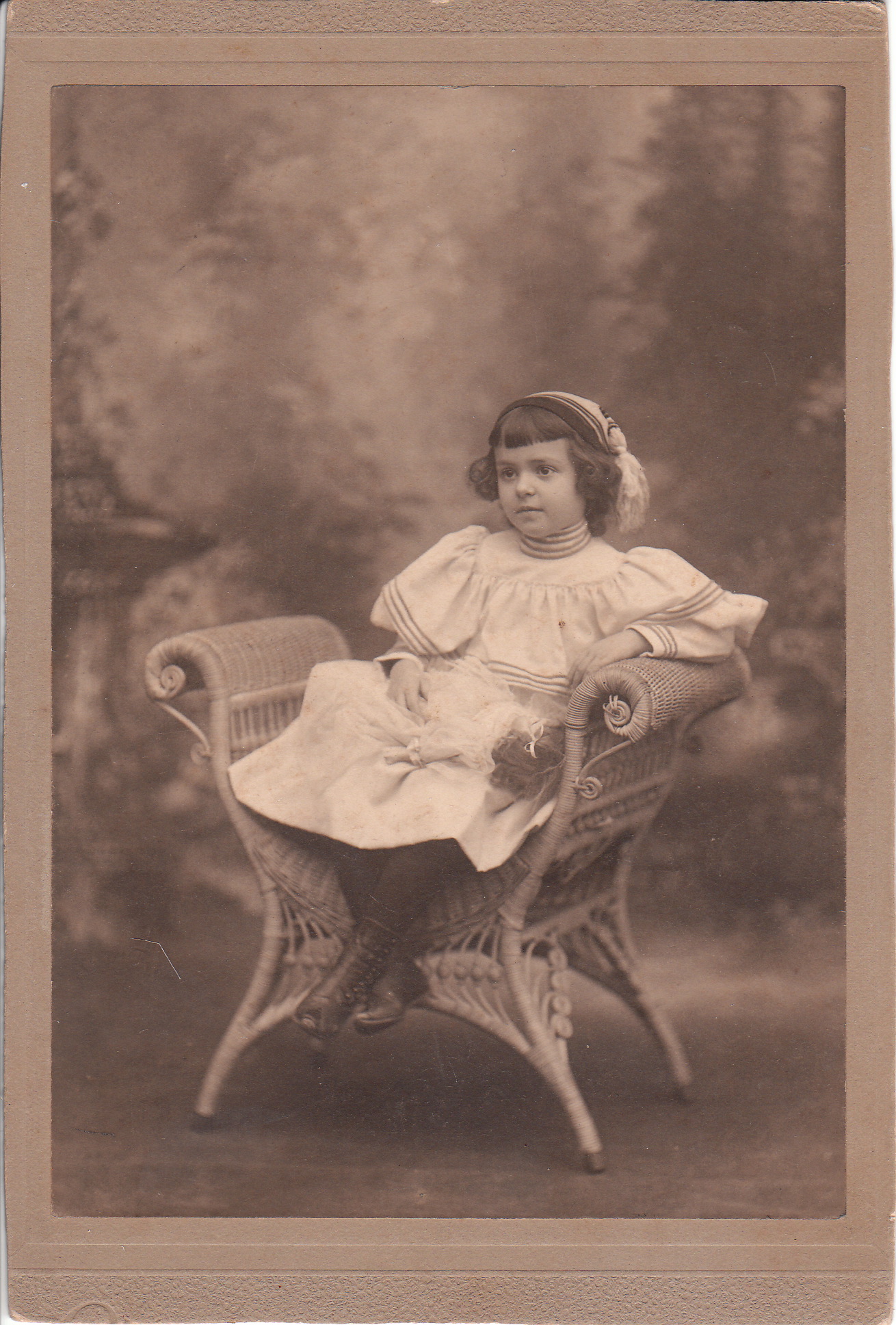 Unlike a lot of children photographed during and soon after the cabinet card era, this child is showing some emotion. It’s exciting to be able to stand on a chair and have parental permission to do so. The child looks adorable in his/her plaid outfit. Note the pretty wicker chair. The Nast studio captured this somewhat unfocussed but lovely portrait.
