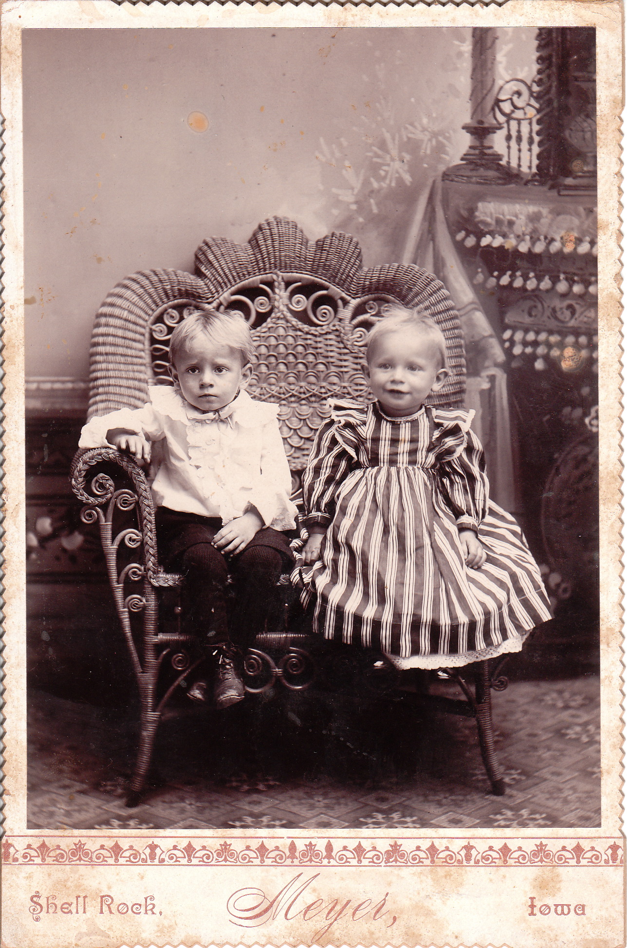 Two adorable kids pose for their cabinet card portrait at the studio of Myer, in Shell Rock, Iowa. The children are most likely siblings; possibly even twins. They are sitting on a large wicker chair. The young girl is smiling and wearing a cute striped dress. The young boy appears less happy than his sister and is wearing a white shirt with ruffles.