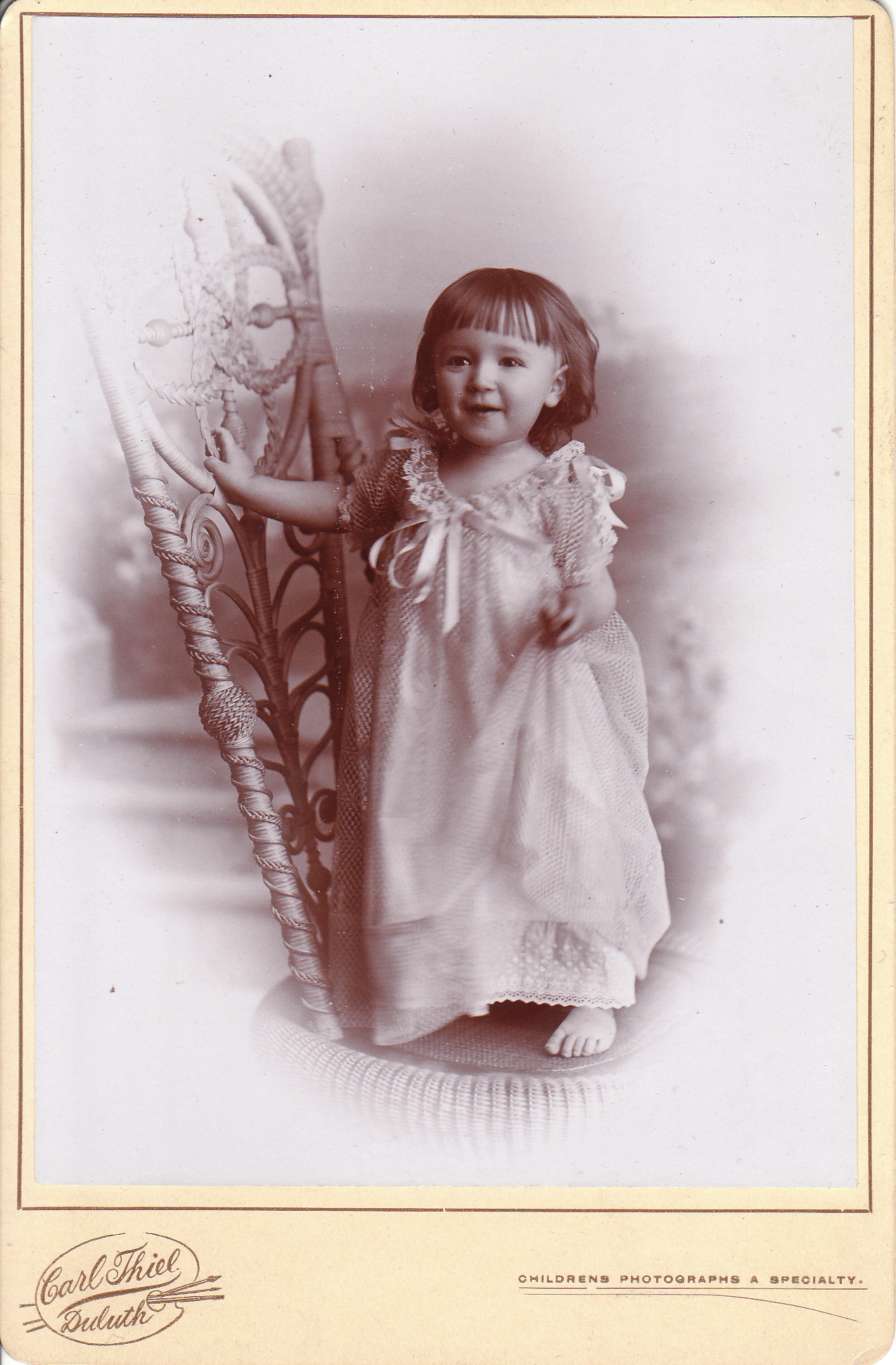 This cabinet card features an adorable little girl standing on a wicker chair as she poses for her portrait. She is barefoot and has a radiant smile. The photographer is Carl Thiel, of Duluth, Minnesota. Thiel was located on Ingalls Block, in Duluth, between 1887 and 1891. His studio moved to 105 West Superior, in Duluth, between 1891 and 1901. It is also known that he had a studio in Hibbing, Minnesota, in 1914. Research reveals that he was a close friend of Feodor von Luerzor (1851-1913), an Austrian born landscape painter who immigrated to the United States in 1886. Thiel, a former actor, occupied a studio in the same building that Von Luezor had his painting studio. Thiel’s cabinet card work is favorably cited in Anthony’s Photographic Bulletin (1888).