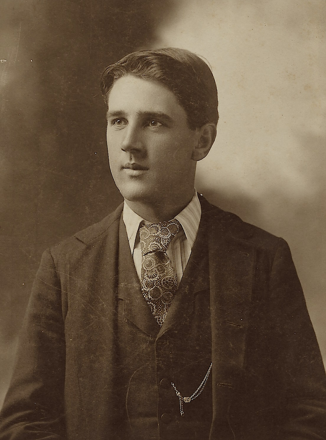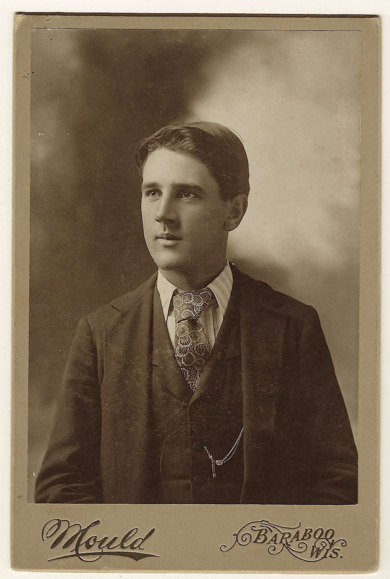 The handsome young man in this photograph is named Howard Briscoe. His name is inscribed on the reverse of this cabinet card photo. Briscoe lived in Baraboo, Wisconsin. He lived there all, or most of his life. Briscoe was born in 1878. His father was a miller by trade, Briscoe’s wife was named Julia Simon Briscoe. Howard Briscoe worked as a carpenter for a railroad company. The photographer of this image, Mr. Mould, is mentioned in a number of photographic journals. He placed an ad for his studio in a book about Sauk County, Wisconsin (1891). The Photographic Times (1898) reports on his appointment to a lobbying committee of the Photographers Association of Wisconsin. The Encyclopedia Dubuque (1911) reveals that Sim Mould operated a photographic studio at 107 Main Street in Dubuque, Iowa. The cabinet card gallery has other photographs by Mould, Place his name in the search box to view these other images. The town of Baraboo is situated on the Baraboo river. The town was settled by Abe Wood and originally called Adams. In 1852 it was renamed Baraboo. In the town’s early history it became the home of several sawmills. In the nineteenth century the town served as the headquarters of several circuses, including Ringling Brothers. Baraboo became known as “Circus City”. SOLD