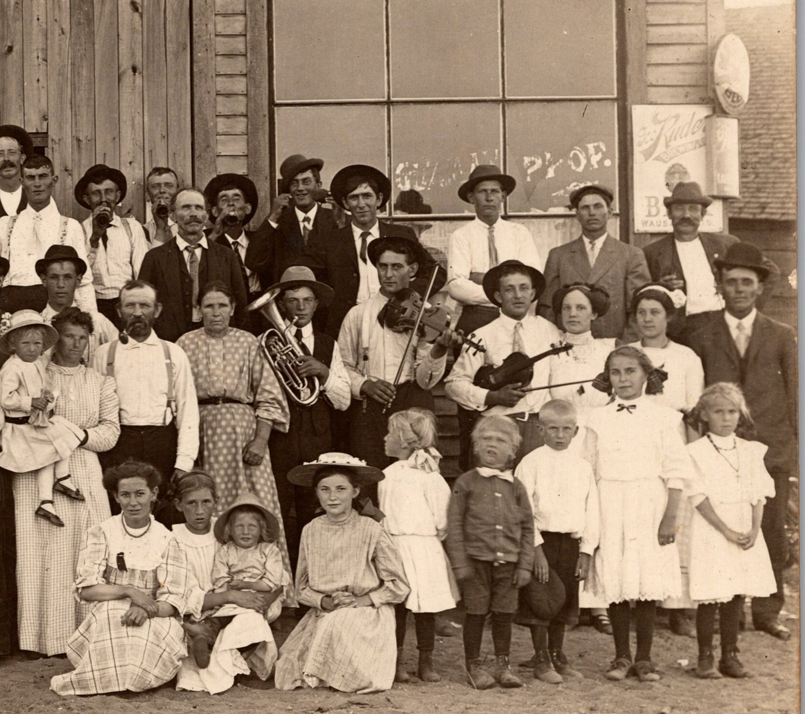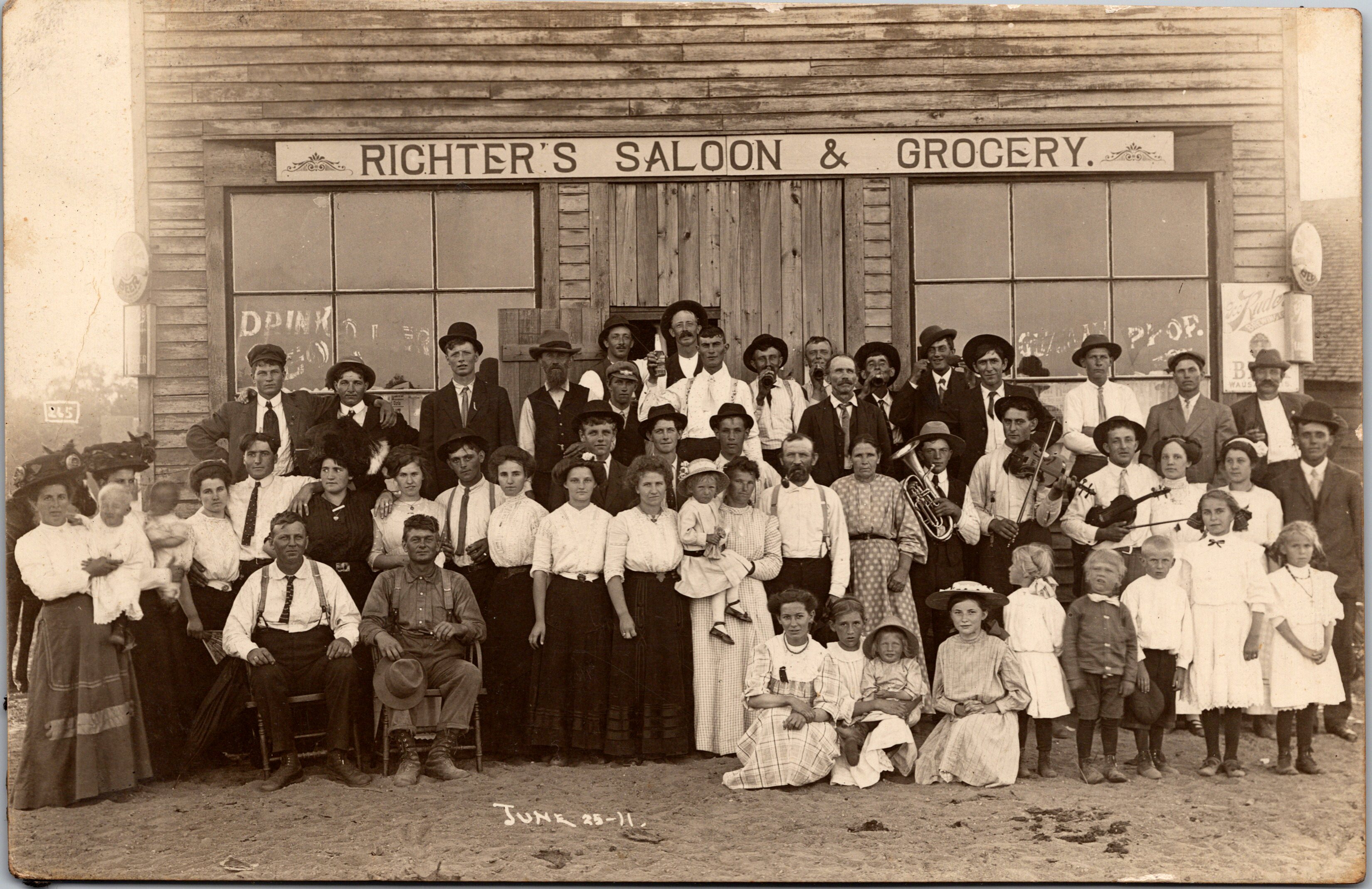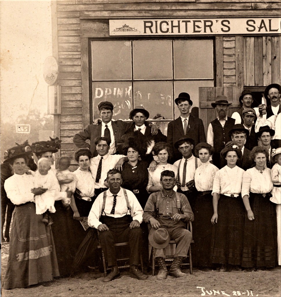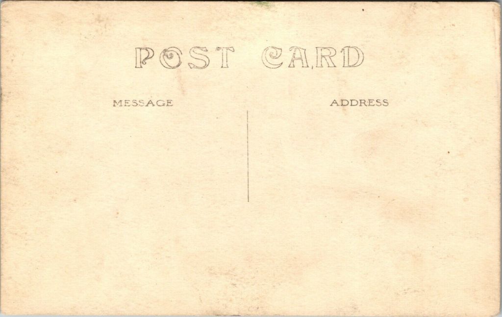 This vintage real photo postcard serves as a wonderful illustration of social history. For a reason unknown to us, the community gathered in front of Richter’s Saloon & Grocery for this photo. The whole town is represented. There are babies, children, and young and older adults. If you look carefully, you will see that there was a lot of activity occurring when this photograph was taken. First, there are a several musicians in the group. Some are playing their instruments while others are displaying them. There are a number of men in the back row drinking out of bottles. Why are they congregated in the back row? It is likely a safe assumption that they are drinking beer or some other form of alcohol. Included in the photo is an oppositional defiant little girl. She is in the first row and is the only child or adult facing the “wrong” way. I’m kidding about the “oppositional defiant disorder” diagnosis. The townspeople in this photograph are wearing an interesting assortment of hats. There is a sign advertising a brewery attached to the front of the building. The advertising is for Ruder Beer. The George Ruder Brewing Company was founded in 1892 and operated until 1920. The company was located in Wausau, Wisconsin. By now, you have probably been wondering where Richter’s Saloon & Grocery was located. I am wondering too. I found two possible locations, but there may be more. An Indianapolis, Indiana city directory lists one of the cities businesses as being William Richter & Son Grocery and Saloon. I can not determine the year of the directory. The second possibility concerning the location of Richter’s Saloon & Grocery is more remote. In 1911, there was a Emilie Richter running a saloon in Milwaukee, Wisconsin. This is the same year that the photograph was taken. I have been unable to learn the name of the saloon. The fact that Milwaukee and Wausau (home of Ruder Beer) are in Wisconsin, may be significant. The Kruxo stamp box on the reverse of this postcard, dates the card to sometime between 1908 and 1920. This supports the 1911 date printed on the front of this postcard. SOLD