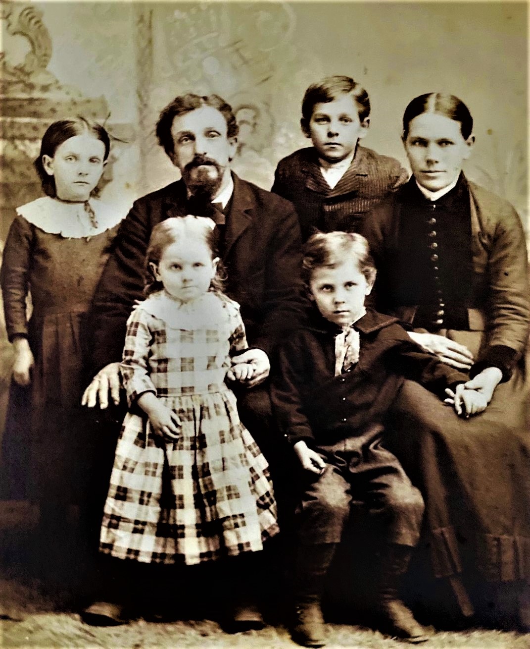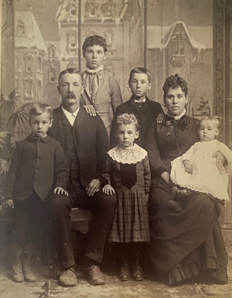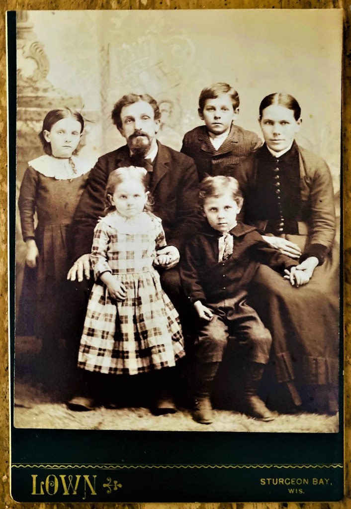 A mother and father and their four children sit for a portrait at a studio in Sturgeon Bay, Wisconsin. The father’s facial expression could be described as “disinterested”. The photographer is Charles H. Lown who operated in Sturgeon Bay between 1887 and 1896. He also may have been there prior to or after these dates. His studio was located on Cedar Street. This cabinet card photograph may have been trimmed. Overall, this photo is in very good condition (see scans).