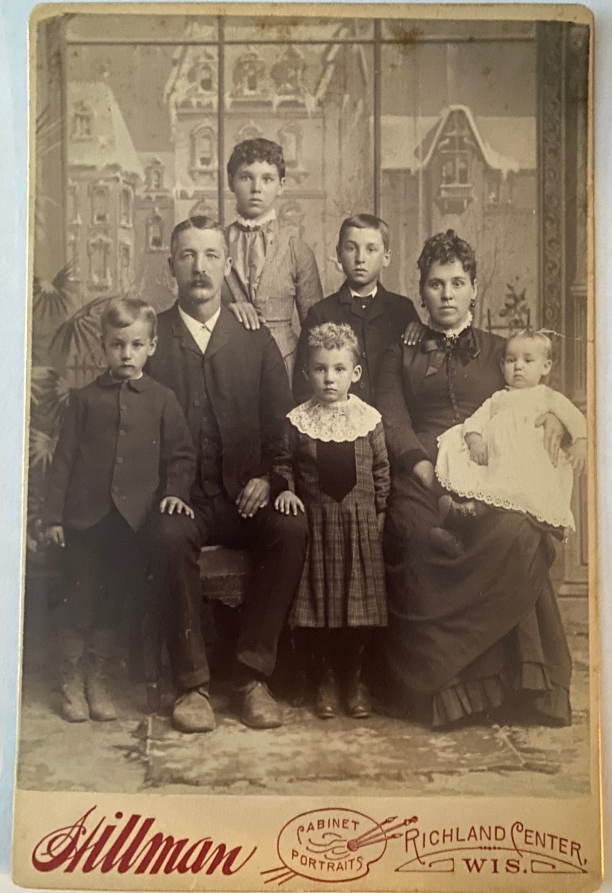This cabinet card photograph features a lovely family of seven. Mom did not take long rest periods between each of her five children. The family dressed nicely for their trip to the photographer’s studio. The photographer of this cabinet card was the Hillman studio of Richland Center, Wisconsin. The 1900 US census reports that William J. Hillman was a 51 year-old photographer, born in New York, and living in Richland Center with his wife Caroline (age 54) and his son Charles B. (age 22). Charles B.Hillman was listed as working as a photographer. The Photographic Times (1907) printed a paper read by Hillman. The paper was entitled ” The Successful Photographer” and the advice given in his presentation was excellent and would be relevant and helpful to modern day business owners. If Hillman was alive today, he would have been an incredible business consultant. The Bulletin of Photography (1914) contains an announcement that the Hillman studio was sold to Frank Dickson. (SOLD)