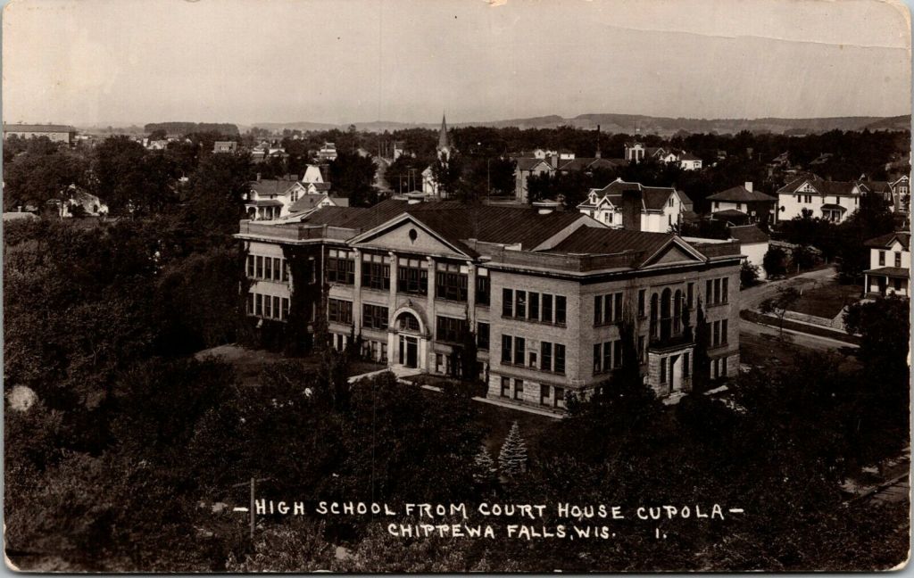 This vintage real photo postcard features a view of the High School from the Court House Cupola in Chippewa Falls, Wisconsin. This is not a common card. The postcard has an AZO stamp box which reveals that the card was published sometime between 1918 and 1930. SOLD
