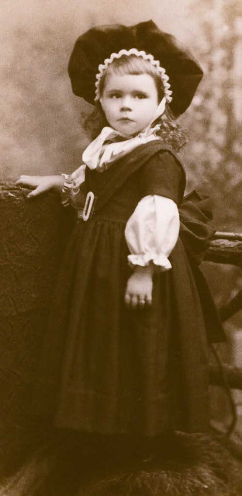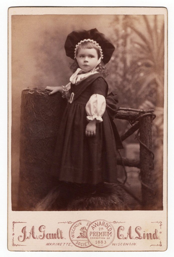 A cute and smartly dressed little girl appears on this cabinet card by J. A. Gault and C. A. Lind at their studio in Marinette, Wisconsin. The child is wearing a large and interesting hat. There is no identifying information available about the child and little about the photographers except that C. A. Lind’s first name is Chris. The photograph was taken sometime during or after 1883. This cabinet card is in very good condition (see scans).