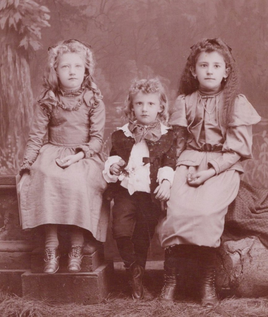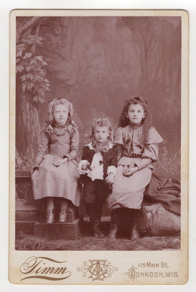 This cabinet card features three very cute young children; presumably, they are siblings The girls are wearing jewelry. The girl on the left of the image is wearing a necklace and the girl on the right is adorned with a necklace, choker, and earrings. The young lad in the center is wearing a large bow tie and is dressed in the fashion of “Little Lord Fauntleroy”. The lad is holding a flower. The photographer of this image is Gustavus Timm (1867- ?). He operated photographic studios in Oshkosh, Wisconsin between 1895 and 1924. He was located at four different addresses while he was in business. The address on this cabinet card indicates that at the time of this photograph, he was located at the site of his first studio. The address on this photograph reveals that it was taken between 1895 and 1898. Gustavus Timm was married to Jennie Timm, who was ten years his junior. They married in 1895. The 1920 U. S. census data discloses that the couple had at least two children; Rhea (age 22) and Ralph (age 11).